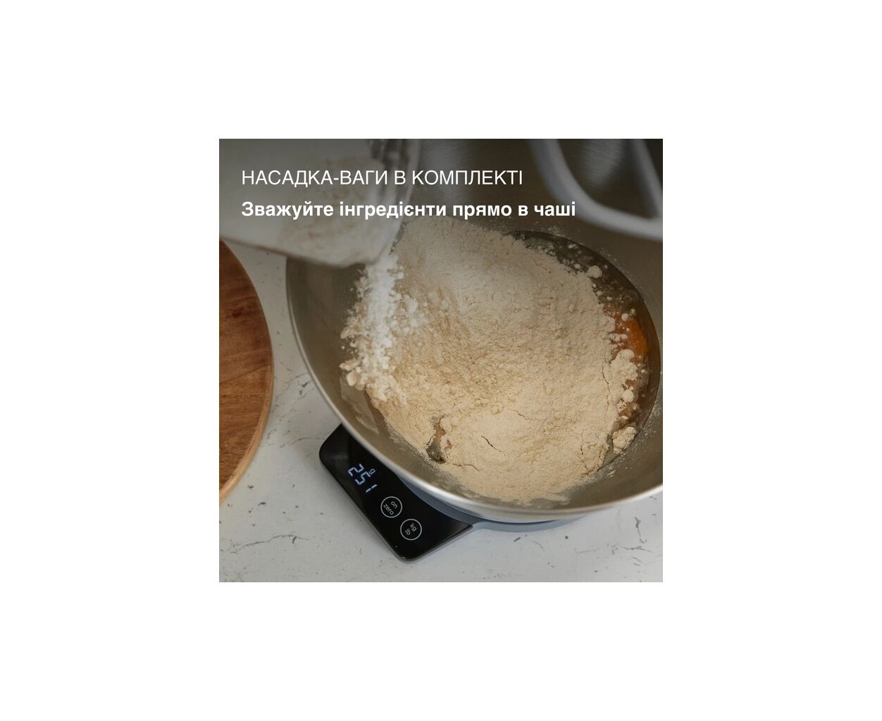 Робот оборудован практичной чашей из нержавеющей стали емкостью 4,3 л, благодаря которой использование большего количества ингредиентов больше не является проблемой. Чаша изготовлена из нержавеющей стали и очень проста в использовании. Это позволяет готовить еду для всей семьи и большой компании друзей. Его мощности достаточно, чтобы за один раз взбить 10 яичных белков, замесить почти 1,5 кг теста или замесить до 900 г теста.