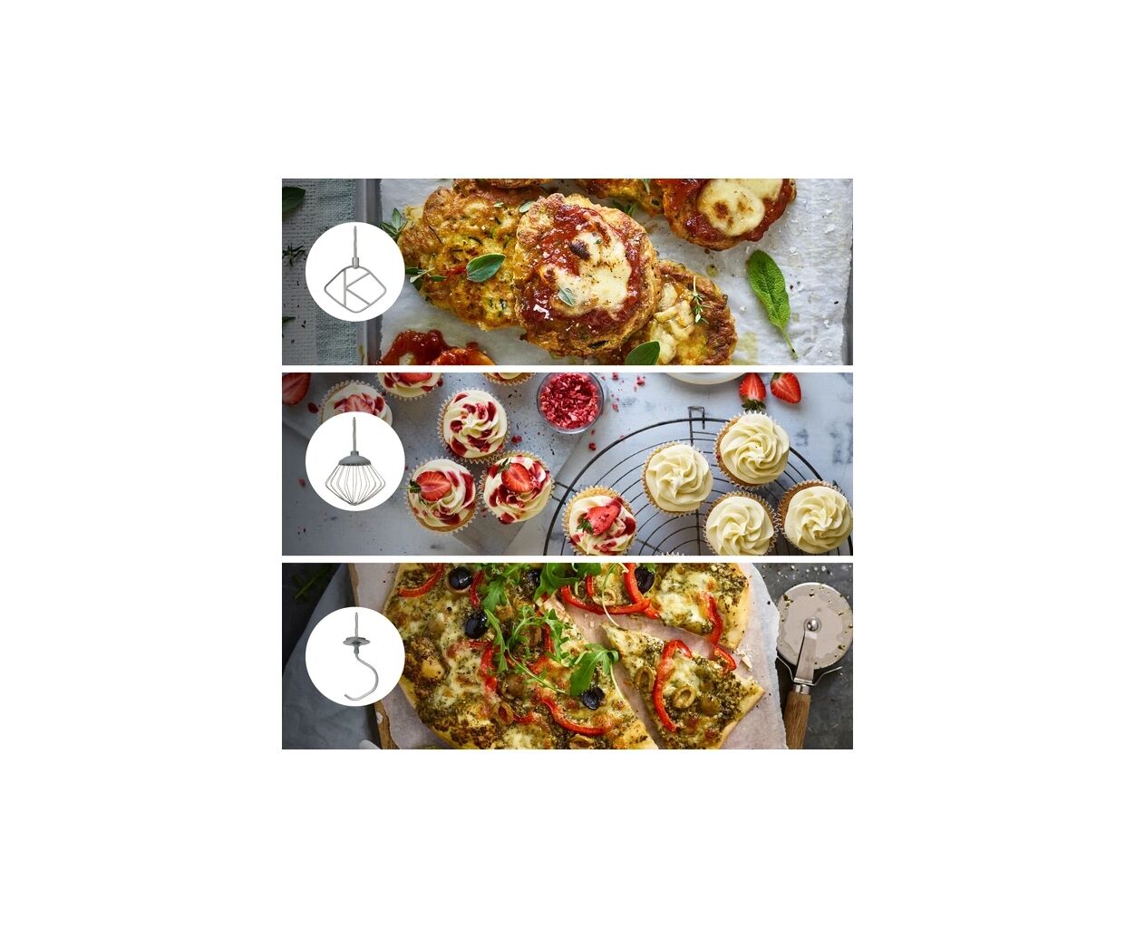 3. Спиральный крюк – быстро и точно замешивает тесто, например, для домашней пасты, пиццы, хлеба или пончиков. Спиральная форма предотвращает чрезмерное расширение теста во время затворения.