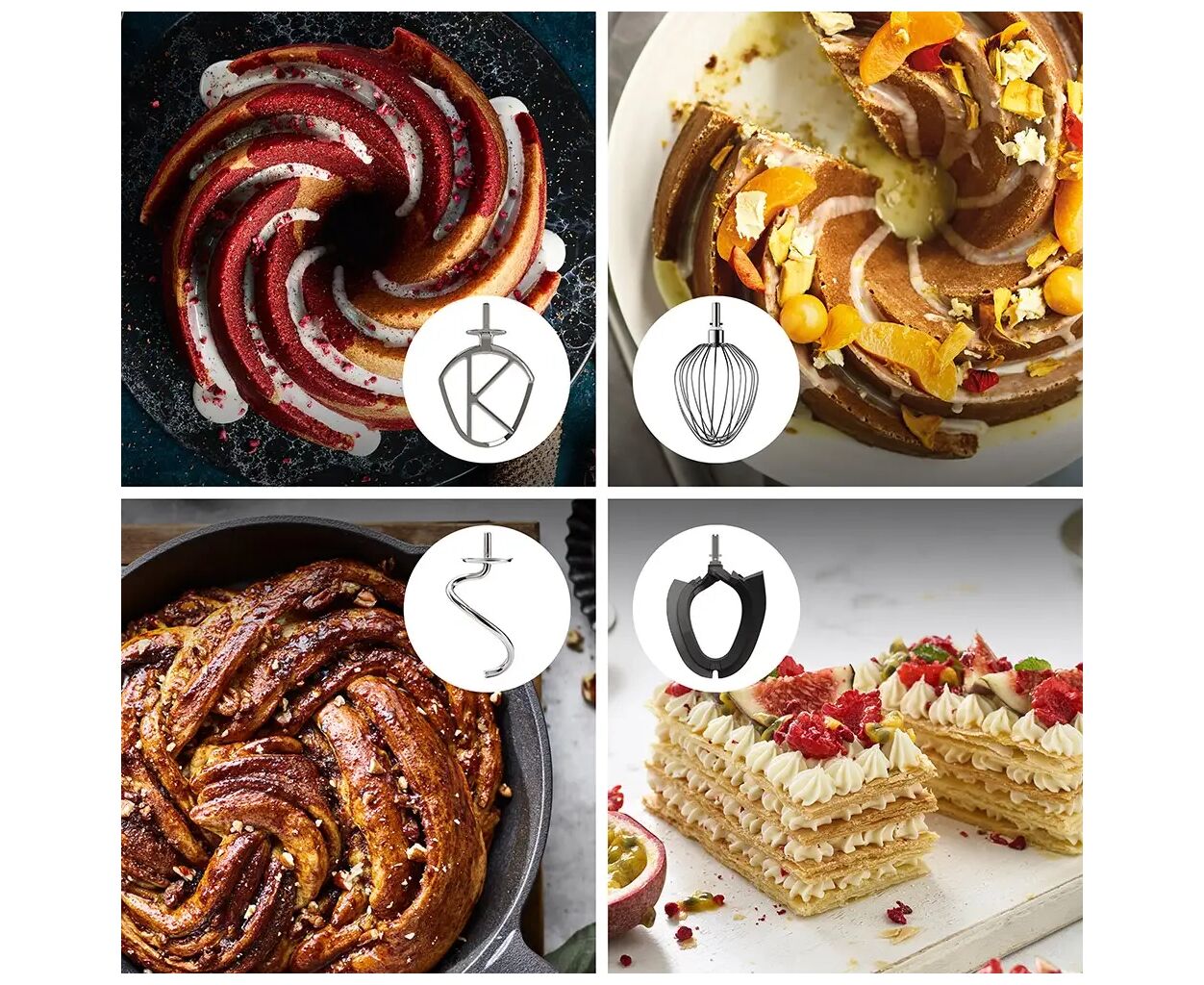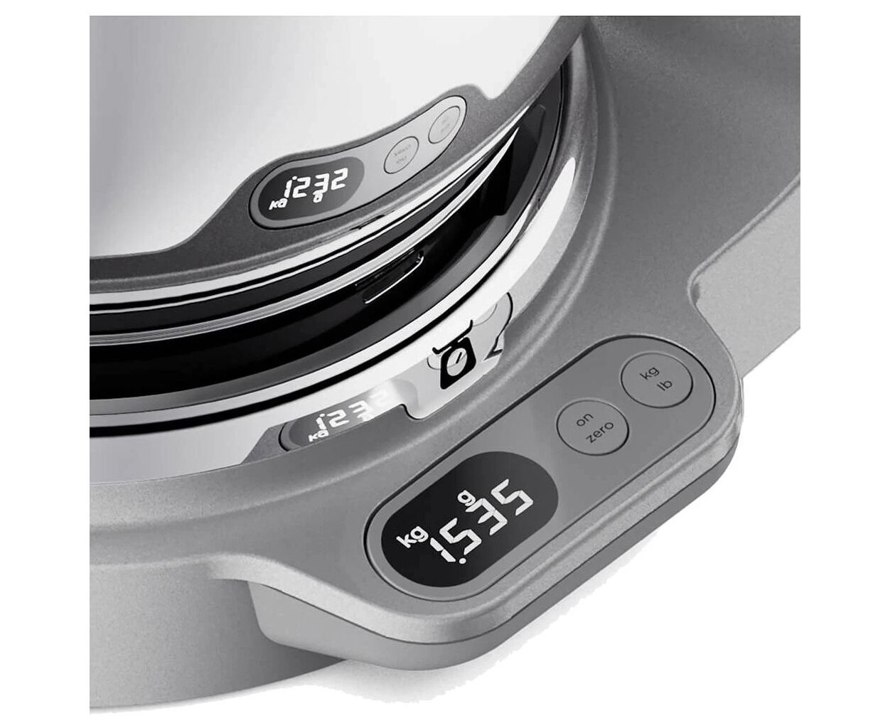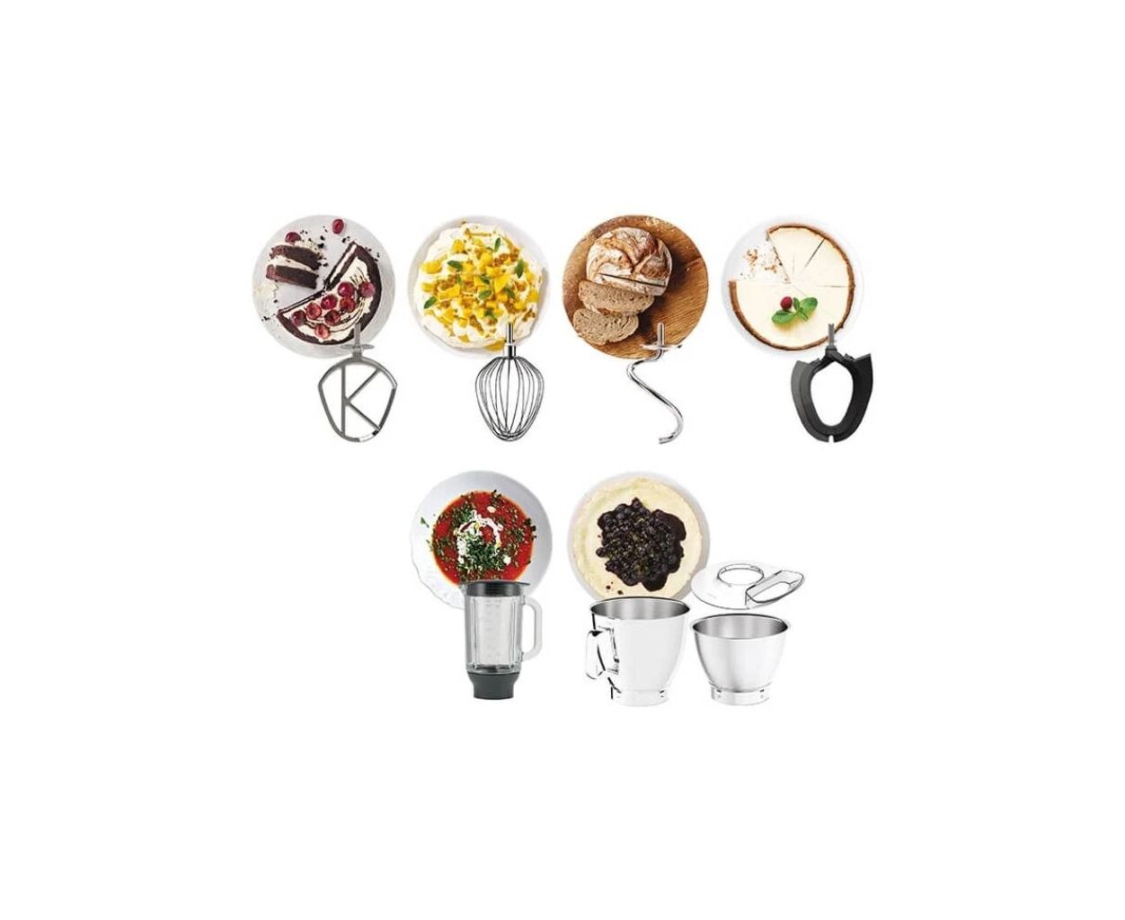 Стандартная комплектация данной кухонной машины включает металлический венчик для взбивания, фирменную К-образную насадку для смешивания, крюк для затворения густого дрожжевого теста, гибкий сбиватель (для кремов), фуд-процессор, стеклянный блендер, а также устанавливаемую прозрачную защитную крышку от разбрызгивания. Кстати, чаш в комплекте здесь сразу две. Основная на 7 и дополнительная на 5 л. Причем основание кухонной машины даже оснащено встроенными электронными весами, что точно пригодится для точного соблюдения пропорций ингредиентов! Кухонная машина может работать без вашего участия автоматически по таймеру (до 30 минут). Двигатель имеет 8 скоростей и режим импульсного смешения (короткие остановки, позволяющие содержимому чаши оседать со стенок).
