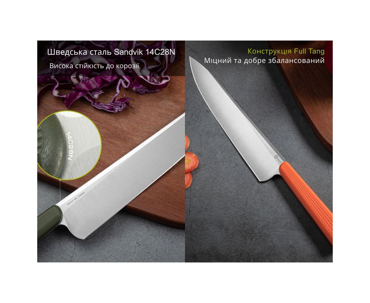 - Клинок из стали Sandvik 14C28N. Сталь производится в Швеции и широко используется в ножевой промышленности. Металл обладает рядом важнейших качеств: стойкостью к деформациям, умеренной жесткостью 58–60 HRC, длительным хранением остроты и отличными антикоррозионными свойствами. Сатиновая обработка придает клинку элегантный вид и снижает вероятность налипания продуктов во время нарезки.