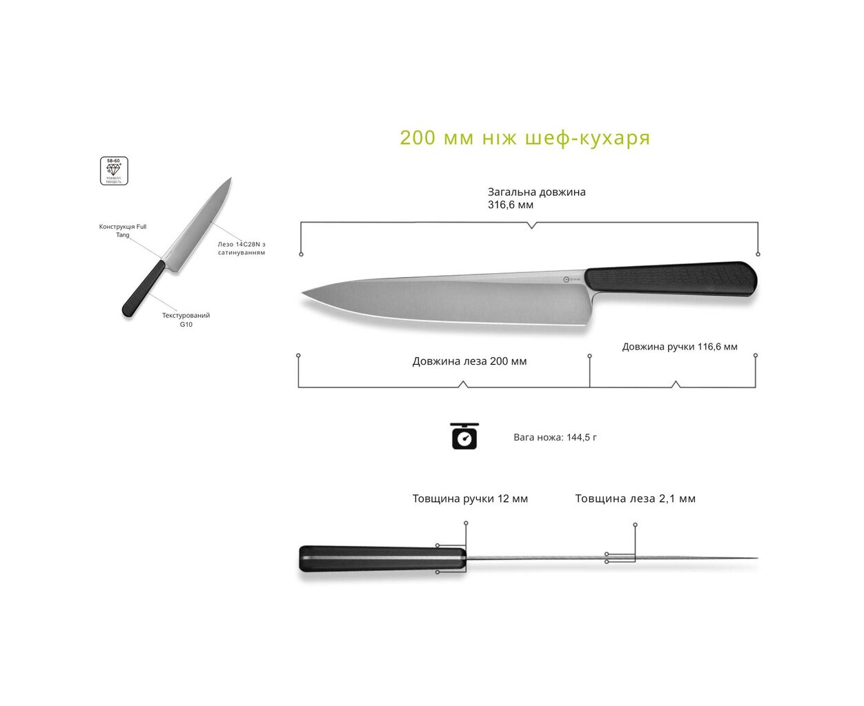 - профессиональный нож шеф-повара с конструкцией Full Tang