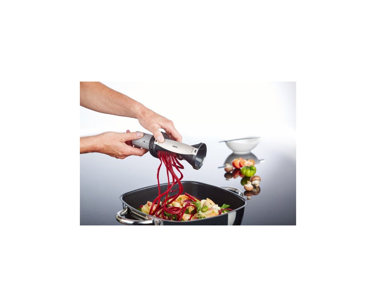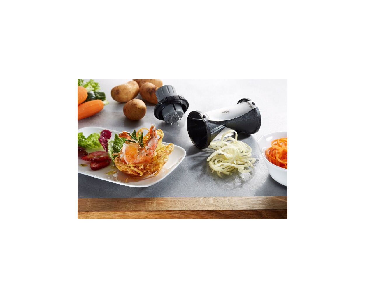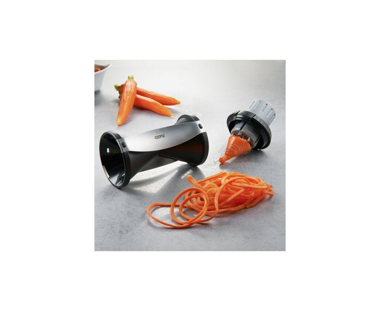 Спиральный нож Gefu Spirelli 2.0 - практичное и инновационное кухонное приспособление, которое порадует любую хозяйку. С помощью острых ножей овощи превращаются в тонкую длинную спираль, которую очень легко готовить и приятно есть. Цукини, огурец, морковь, кабачок и другие овощи приобретают неповторимый вид серпантина, который удивит любого гурмана. Держатель поможет нарезать овощи с минимальным остатком, а также защитит Ваши пальцы от повреждения о лезвия Spirelli.