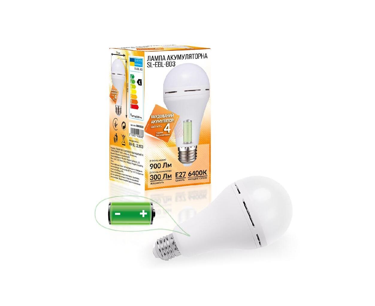 Тип лампы - светодиодные (LED), тип цоколя - E27, Мощность - 9 Вт, цветовая температура - 6400 К, 220-240 В, Особенности - с аккумуляторной батареей, энергоэффективность 80% (A+), Высота - 130 мм