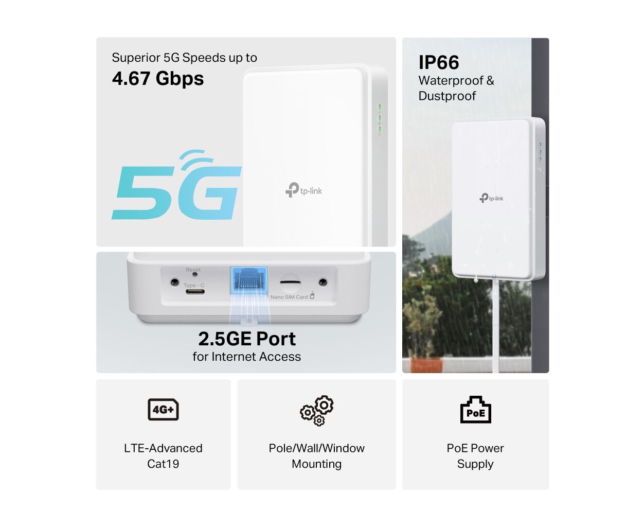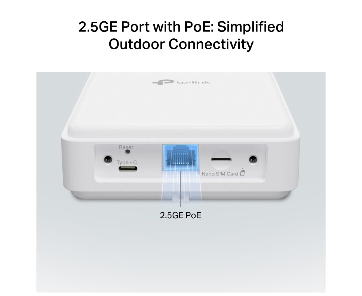 TP-LINK NE200-Outdoor – внешний маршрутизатор с поддержкой 5G, созданный для стабильного мобильного интернета вне помещения. Устройство поддерживает широкий диапазон частот 5G, 4G и 3G и обеспечивает высокую скорость передачи данных. Порт 2,5 Гбит/с с поддержкой PoE позволяет передавать питание и данные по одному кабелю. Защищенный корпус подходит для работы в сложных погодных условиях. Простое подключение через SIM-карту позволяет быстро развернуть сеть.