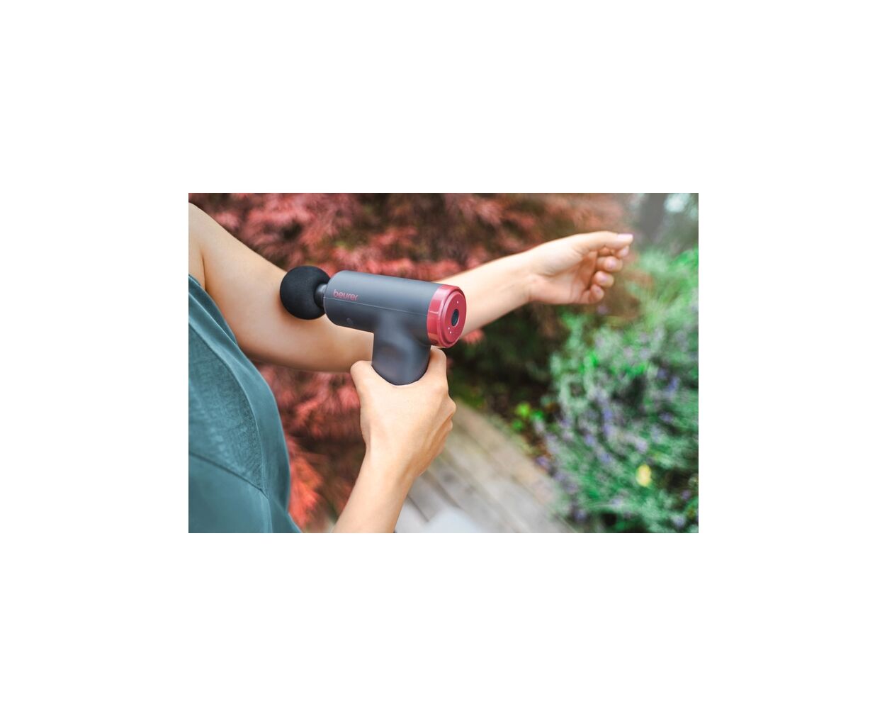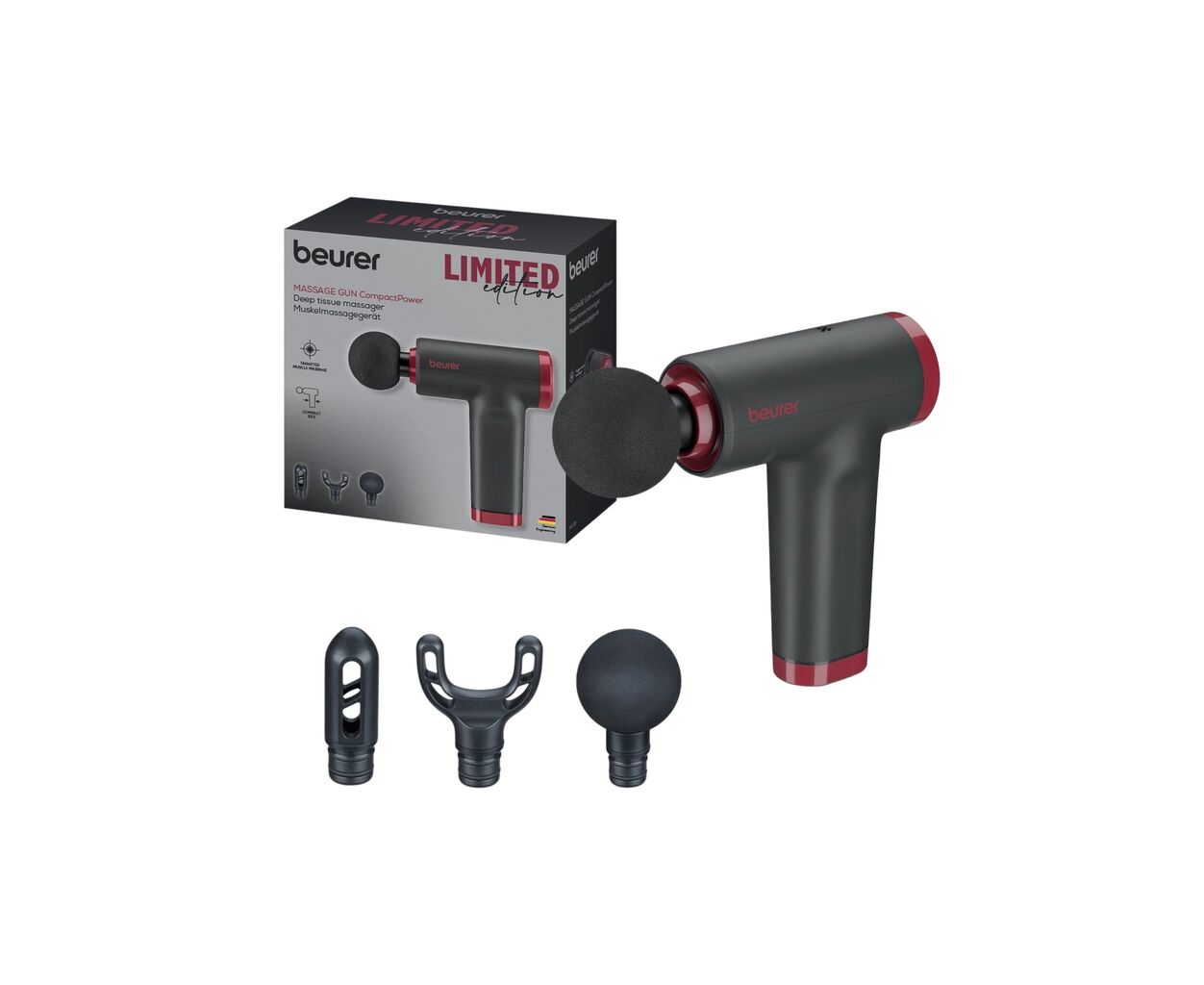 Стильный перкуссионный массажер Beurer MG 89 LE CompactPower из лимитированной серии Black Friday 2025 в трендовом вишневом цвете — для быстрого восстановления и максимального расслабления.