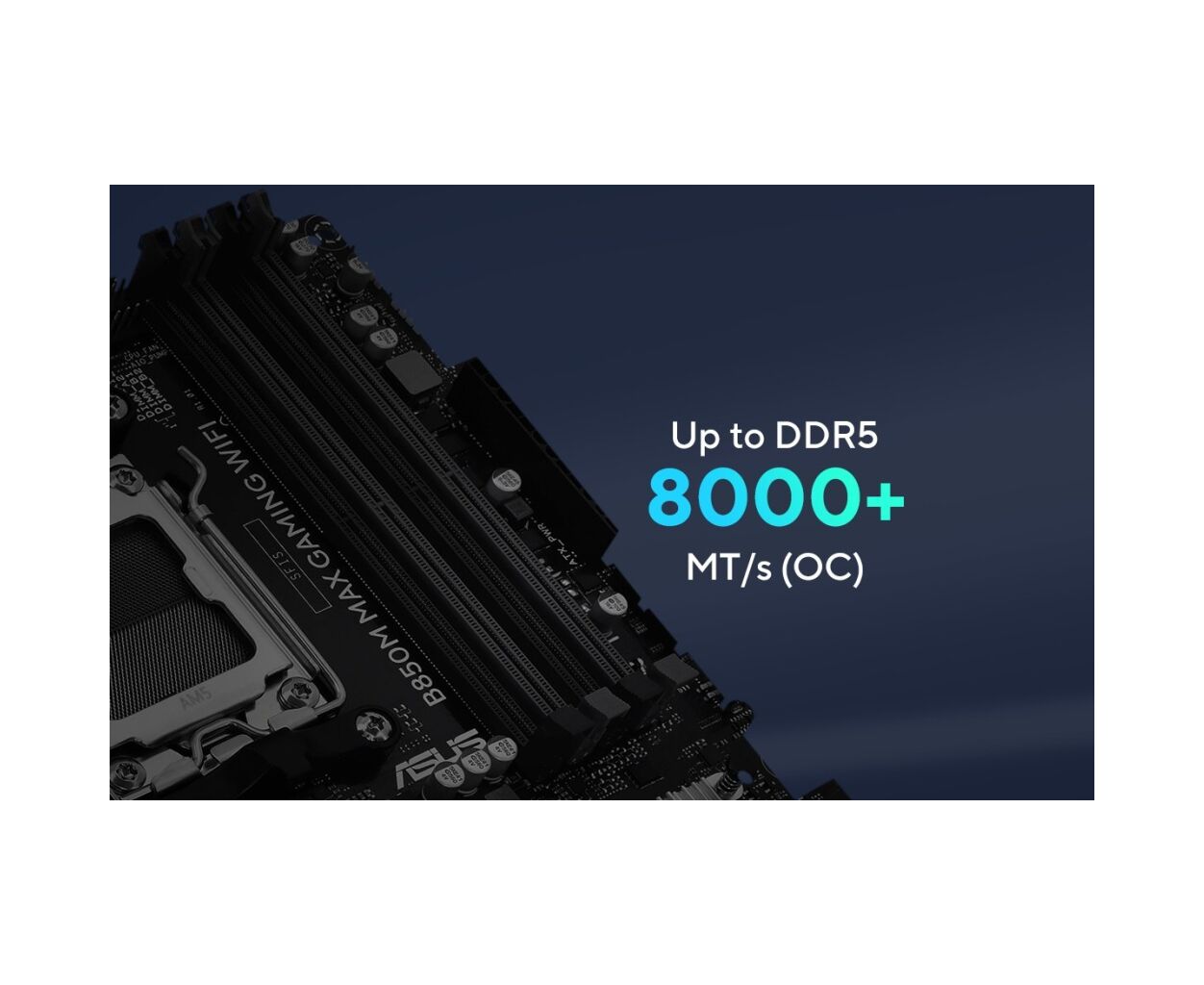 Материнская плата поддерживает процессоры AMD Ryzen 9000, 8000 и 7000 серии. Четыре слота DIMM DDR5 позволяют установить до 256 ГБ оперативной памяти, а технологии AMD EXPO и ASUS AEMP обеспечивают оптимизацию разгона памяти. Возможен разгон памяти до 8000+ MT/s.