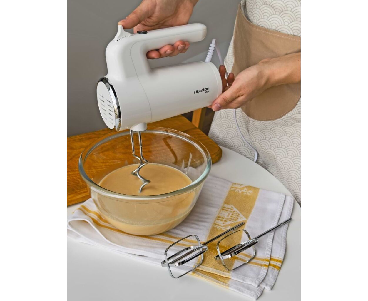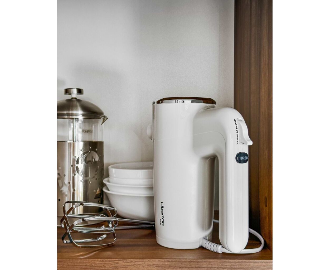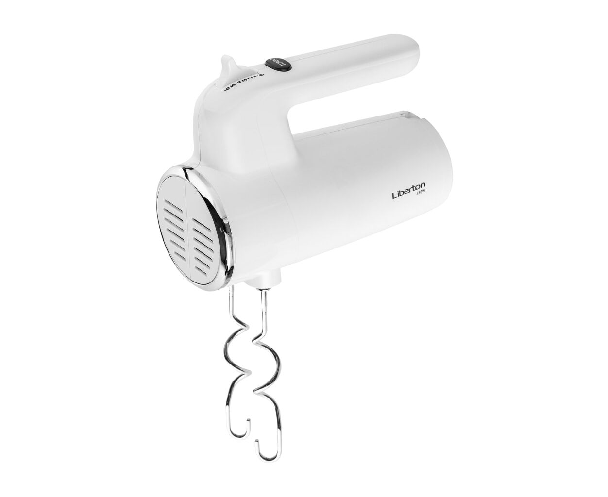 Мощность: 450 Вт; Кол-во скоростей: 6; Режим "Турбо": да; Насадки: венчики, крючки для теста; Материал насадок: хромированная сталь; Кнопка извлечения насадок: да; Материал корпуса: ABS пластик; Длина шнура: 0,9 м; Размер изделия: 18,7х8,5х15,2 см; Цвет: белый.