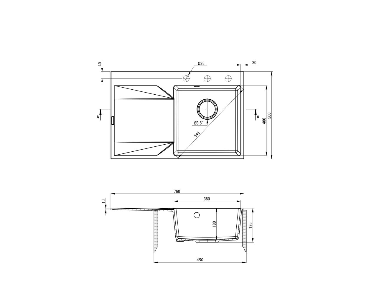 Серия - Evora, Тип установки - врезная, Количество раковин - 1 основная, Форма - прямоугольная, Материал - гранит, Цвет - темно-серый