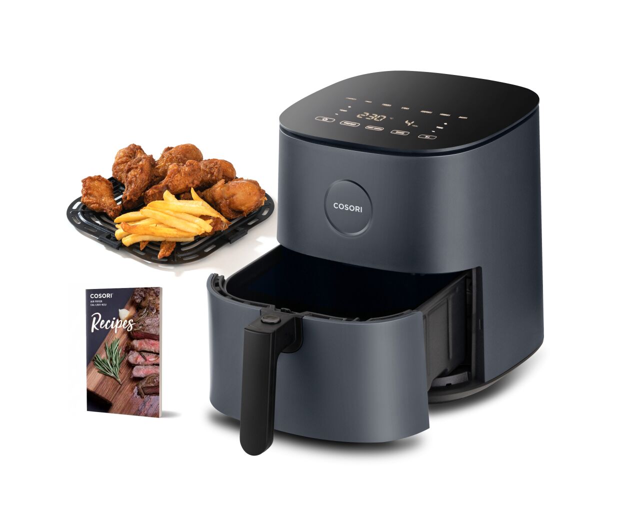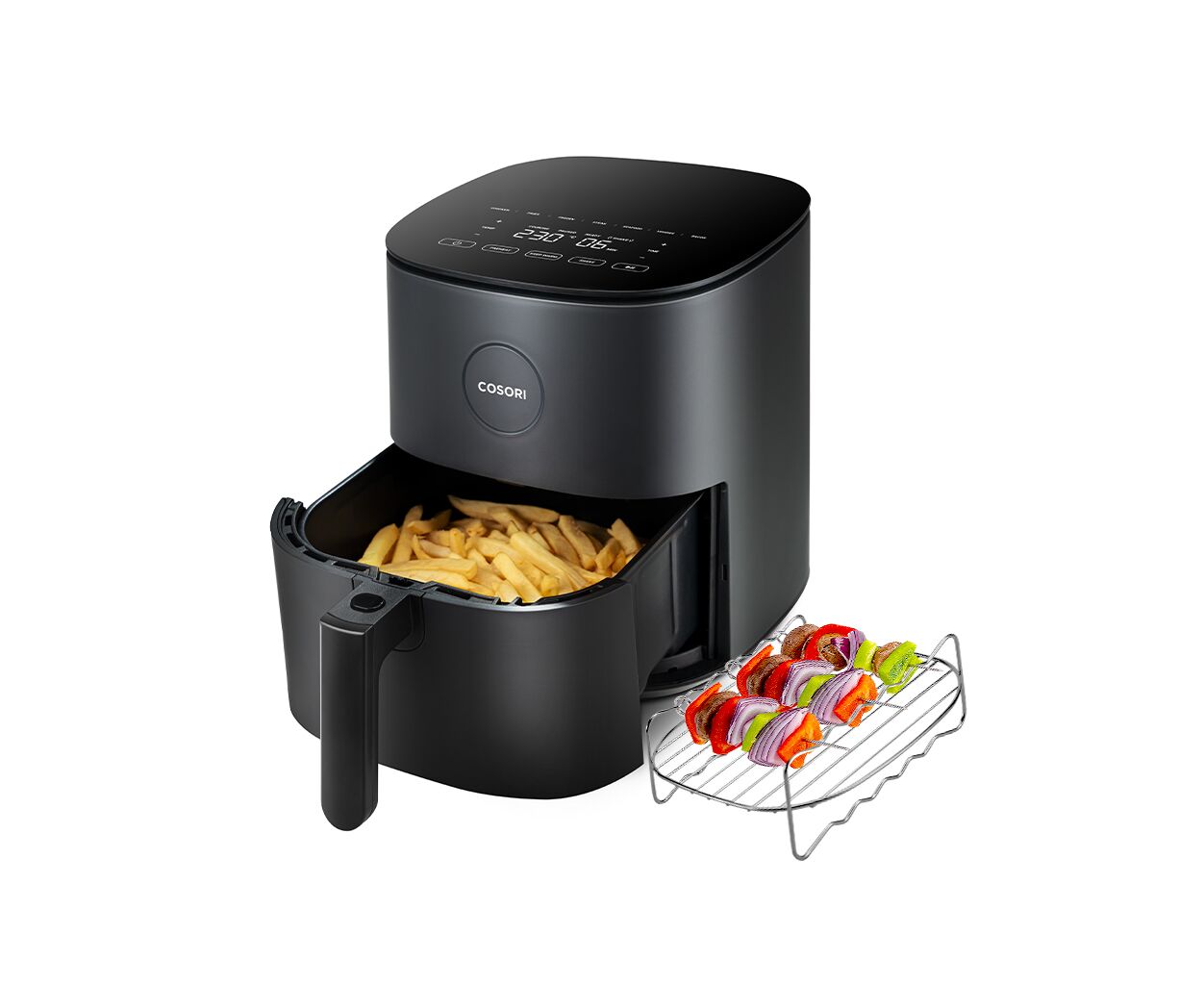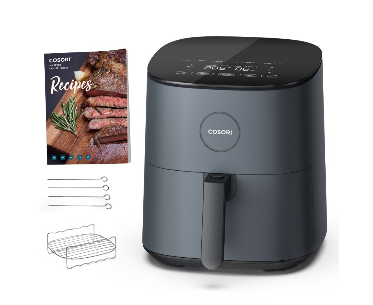 С мультипечью Cosori вы сможете наслаждаться самым вкусным мясом даже дома. Сочный шашлык и вкусные овощи, которые напоминают мангальный вкус, теперь доступны благодаря удобным шампурам в комплекте. Они легко устанавливаются на специальную сетку, которую также можно использовать отдельно. И самый большой бонус к мультипечи — оригинальная электронная книга рецептов. Почувствуйте себя настоящим поваром, но без лишних усилий.