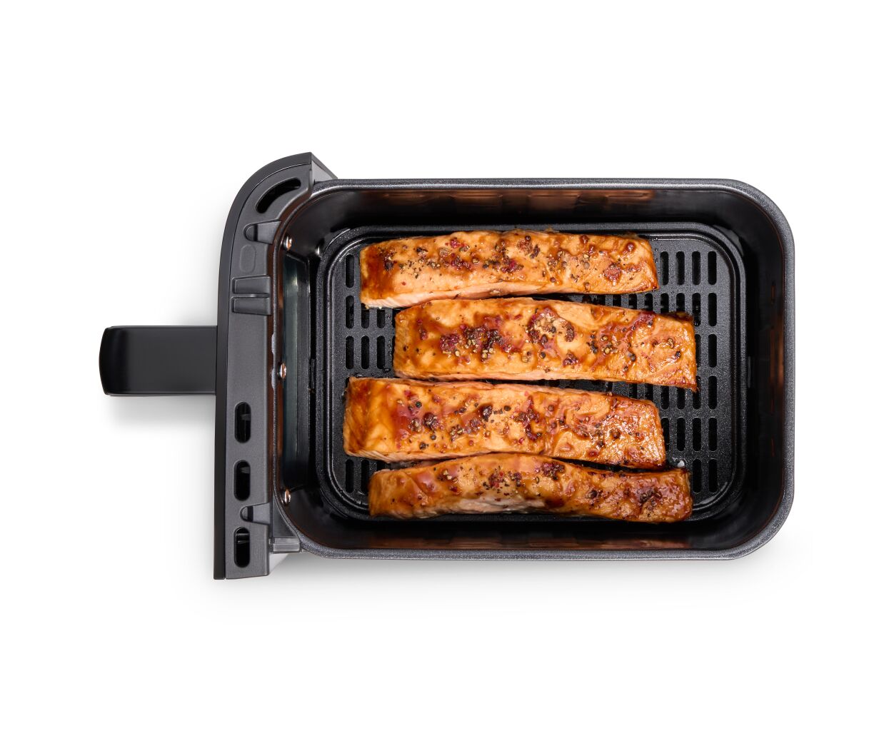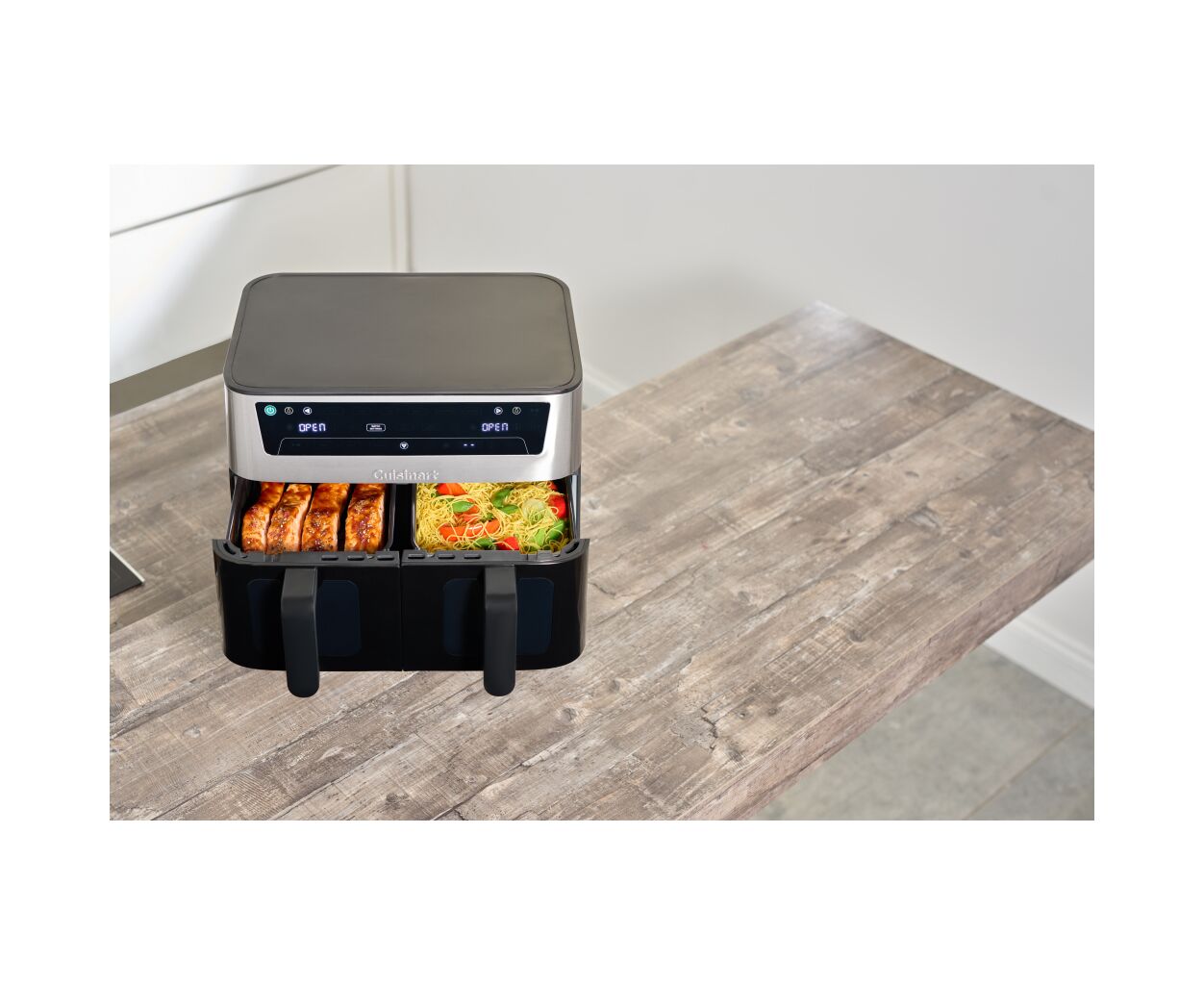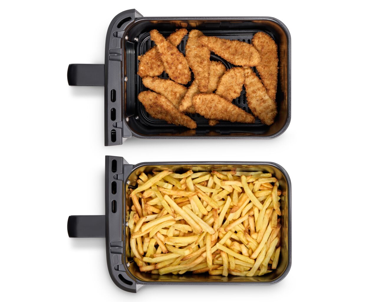 Двойные корзины оснащены смотровым окном и внутренним освещением, позволяя контролировать блюдо, не открывая ящики. Каждая корзина поддерживает функции air fry, roast, grill, bake, re-crisp и dehydrate и нагревается до 210°C.