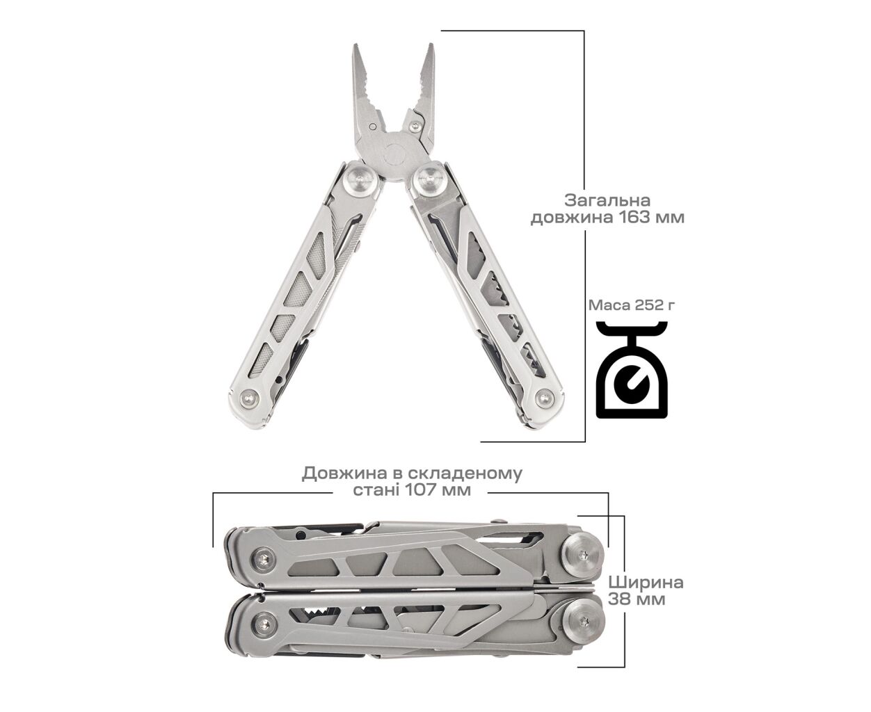 Длина мультитула составляет 163 мм, а вес — 252 г. Это делает его легко переносимым и удобным в использовании. В комплект также входит нейлоновый чехол, который обеспечивает дополнительную защиту и удобство в транспортировке.