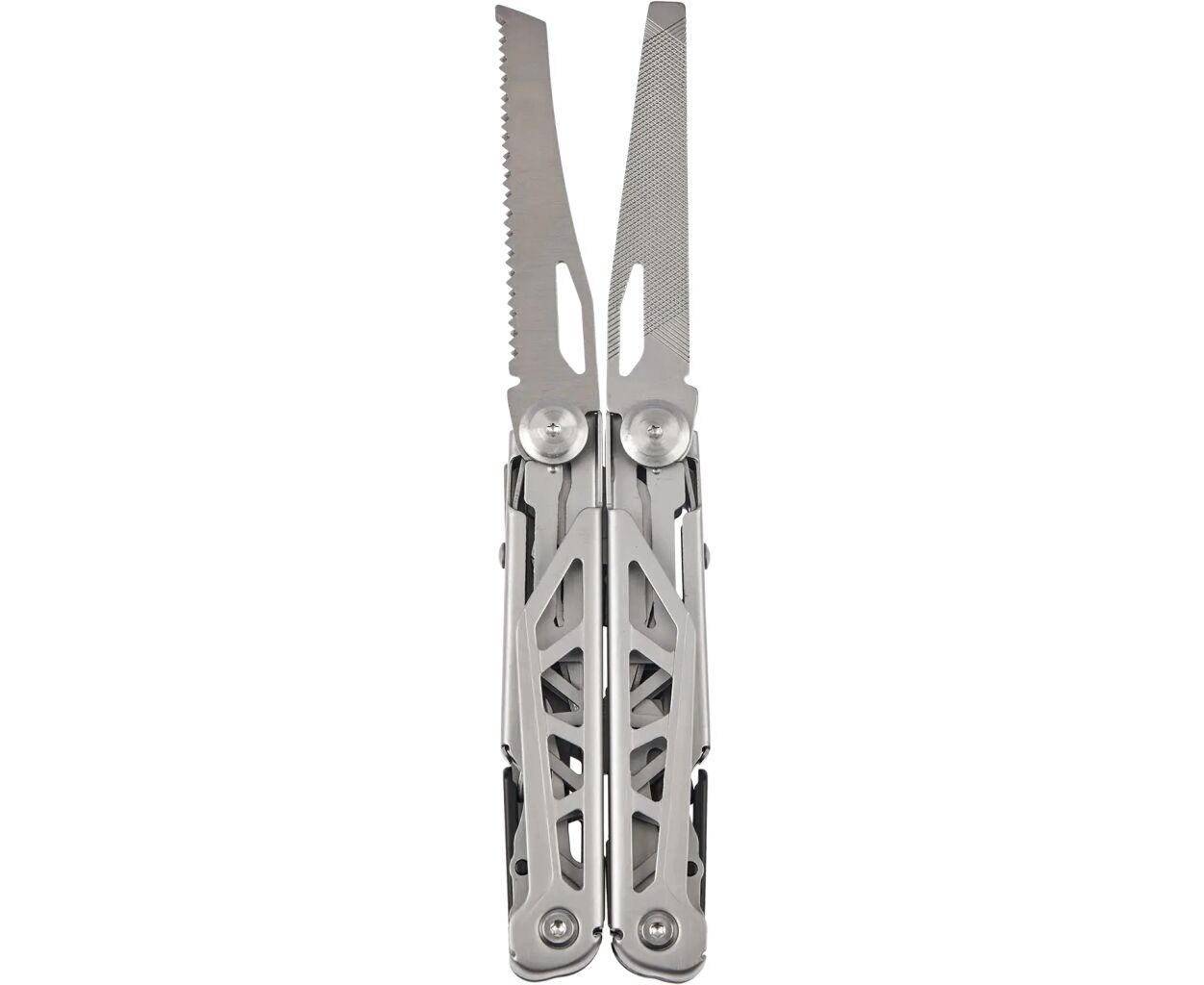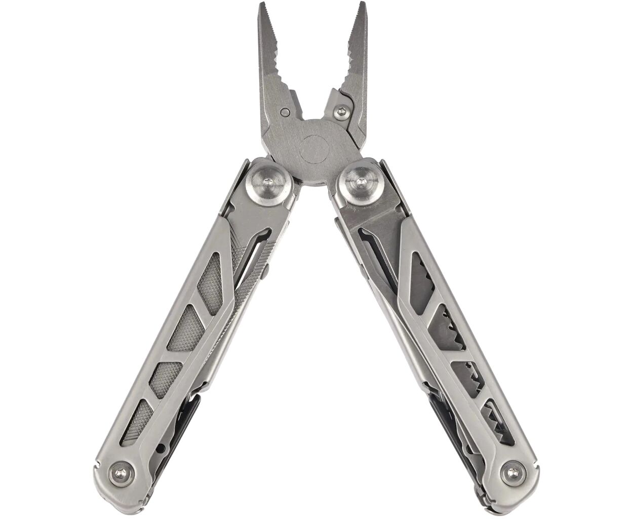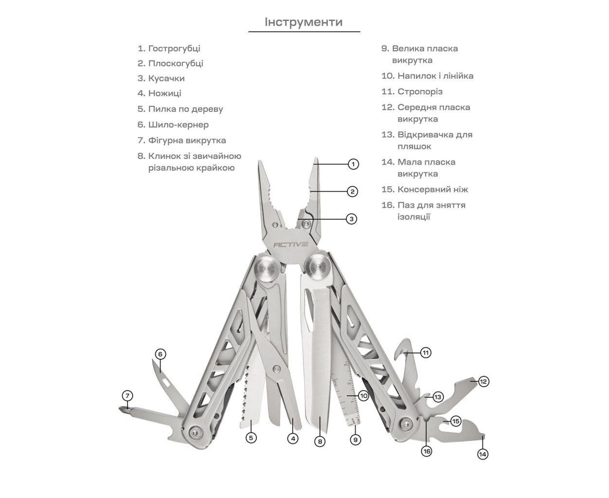 Особое внимание стоит уделить многофункциональности: этот карманный инструмент оснащён 16 инструментами, среди которых плоскогубцы, ножницы, пила, стропорез, несколько видов отвёрток, линейка, напильник и даже шило-кернер. Также есть такие полезности, как открывалка для бутылок и консервный нож, что делает его чрезвычайно удобным для кемпинга или других активных занятий на открытом воздухе.
