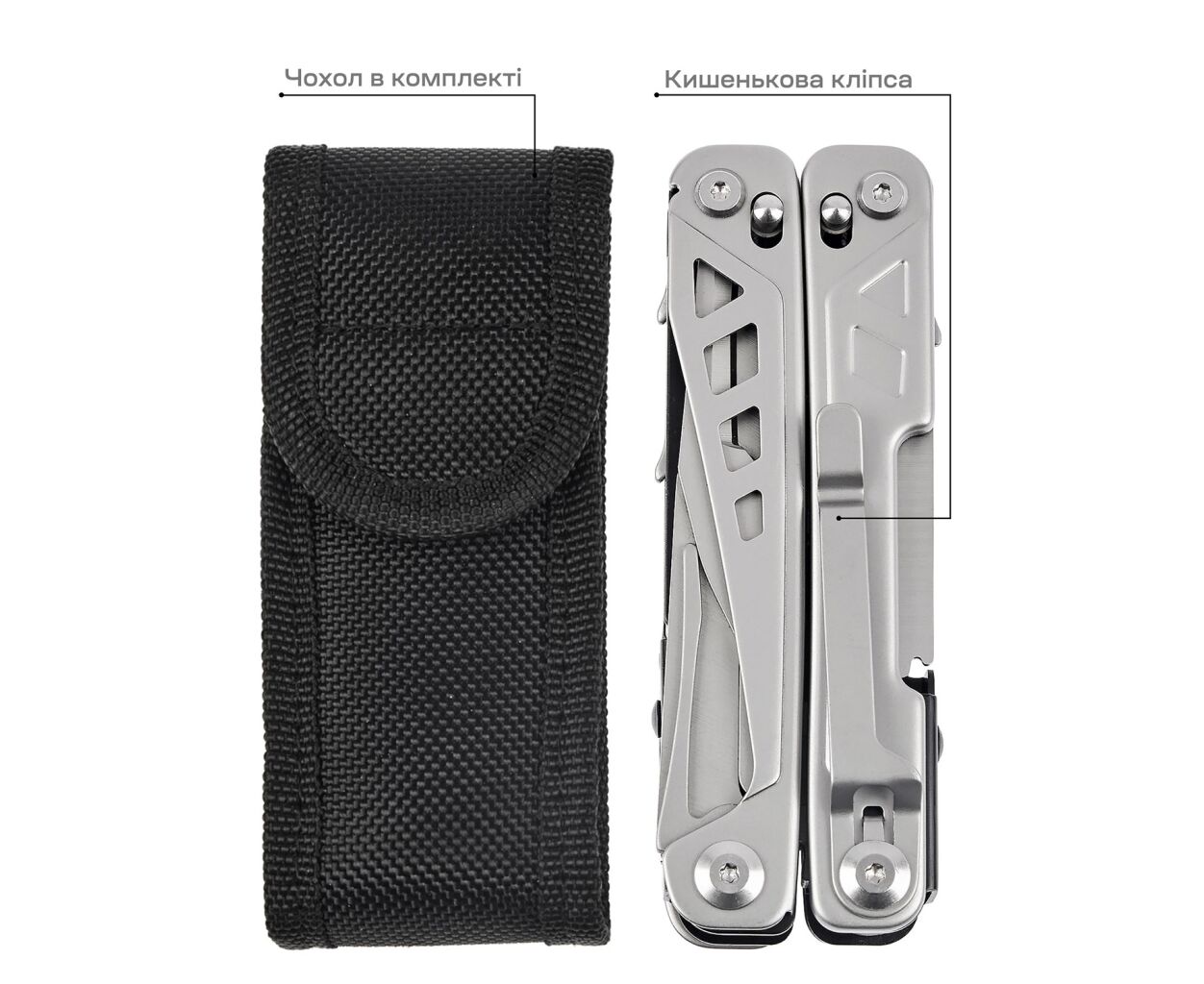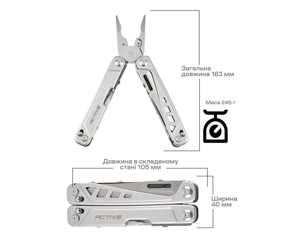 Длина мультитула – всего 163 мм, а вес – 245 г, что делает его лёгким в транспортировке. Кроме того, благодаря стильному серебристому цвету и включенному нейлоновому чехлу, вы сможете удобно носить его с собой где угодно. Особо следует отметить карманный формат мультитула, который позволяет всегда иметь под рукой все инструменты, необходимые для мелкого ремонта, отдыха на природе или неожиданных ситуаций.