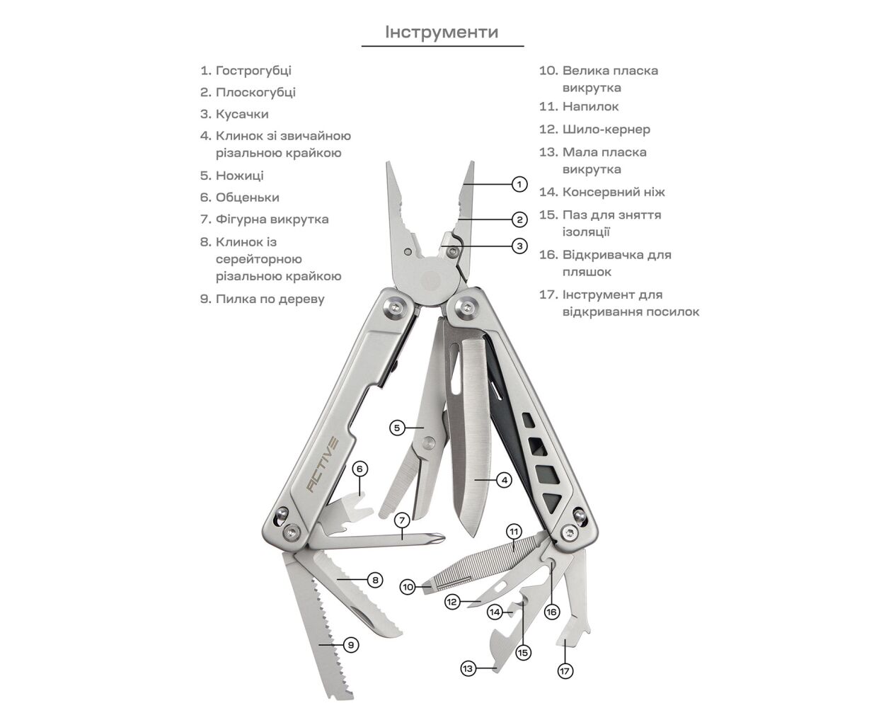 Active Launch 5 содержит целых 17 инструментов, среди которых вы найдете всё необходимое: от классических плоскогубцев с кусачками до серрейторного клинка и специального инструмента для открытия посылок. Многофункциональность обеспечивается также наличием открывашки для бутылок, шила-кернера, гвоздодёра и даже пилы для дерева. Уникальность этой модели заключается в её способности эффективно сочетать полный спектр инструментов в компактной форме.