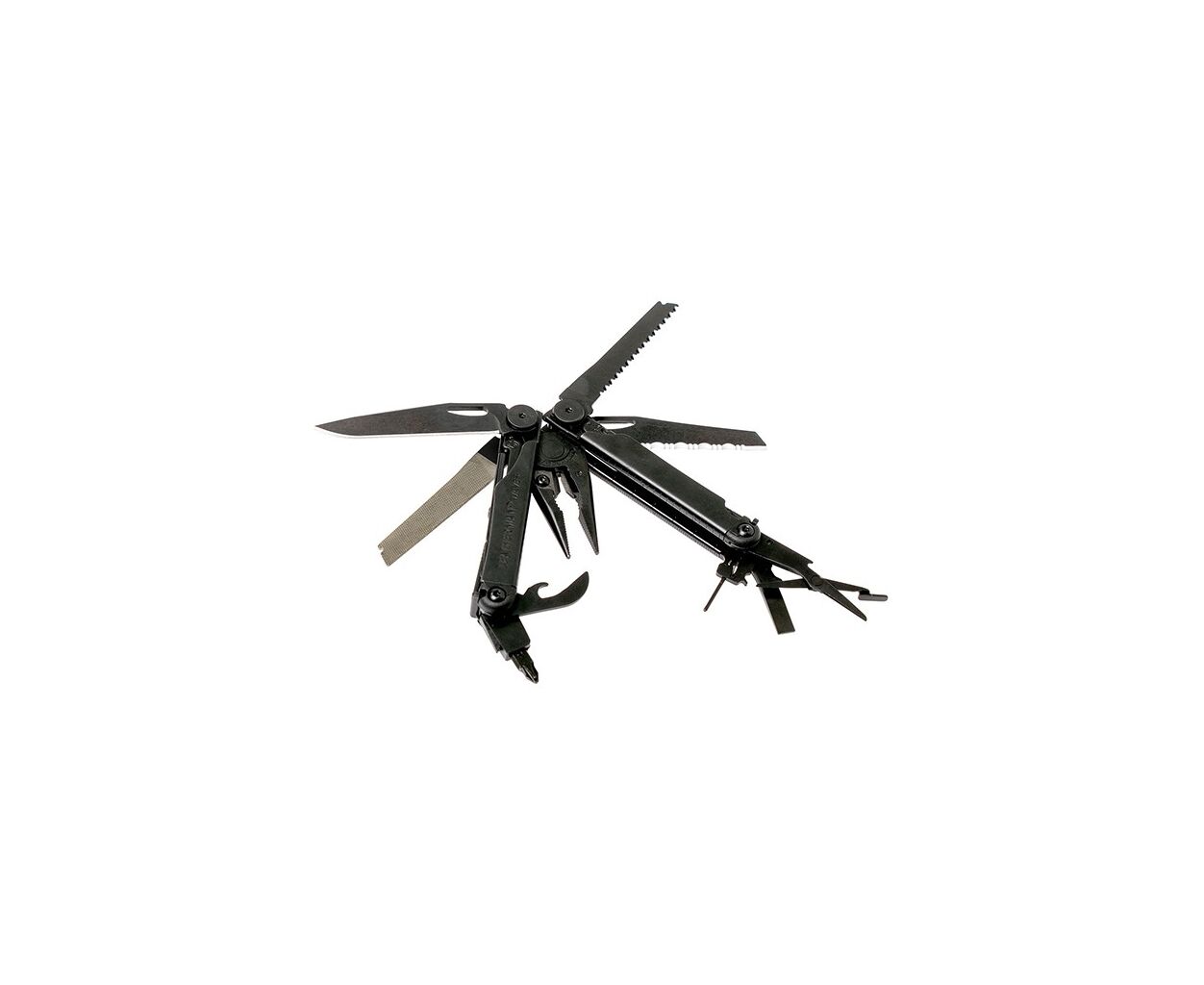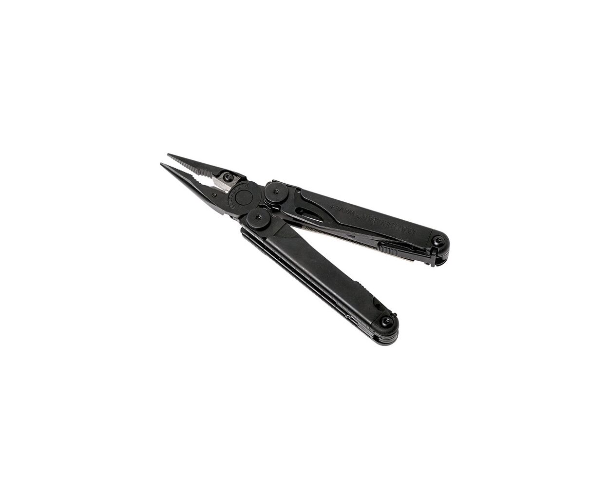Wave Plus Black от Leatherman предлагает 18 функциональных элементов, которые способны справиться с широким спектром задач. В его состав входит обычный нож с прямым лезвием и серрейтор из стали 420HC, предназначенные для резки твердых материалов, включая картон, веревки, канаты, пластик, тенты, ремни из нейлона и кожи и т.д. В арсенале также есть плоскогубцы, острогубцы, держатели для больших и малых бит, сменные биты, стандартные съемные кусачки и кусачки для твердой проволоки, средняя отвертка, ножницы, пила, напильник для дерева и металла, алмазный надфиль, открывалки для бутылок и консервных банок, линейка длиной 19 см и прибор для очистки проводов, о которых мы подробнее говорили в нашей статье.