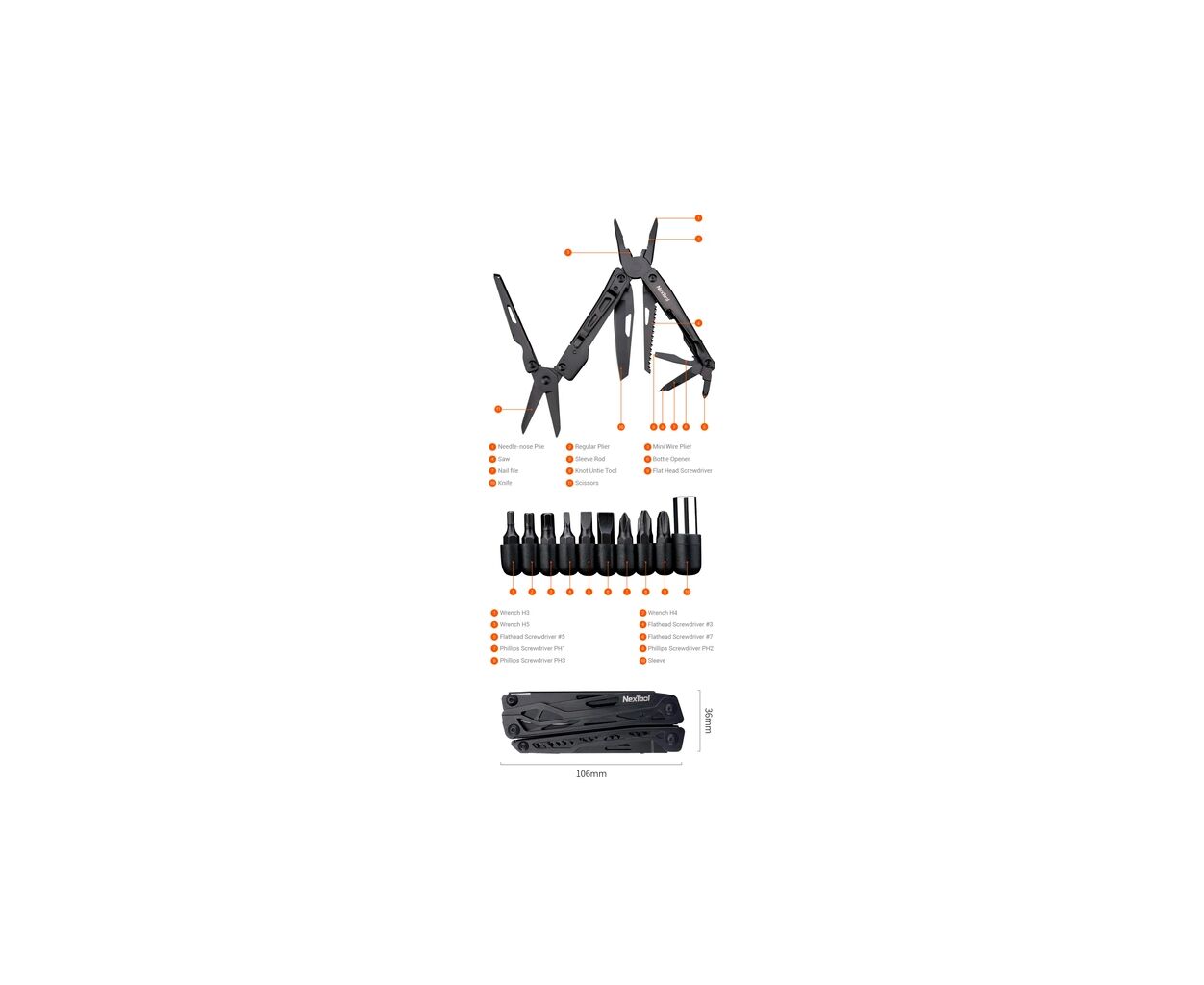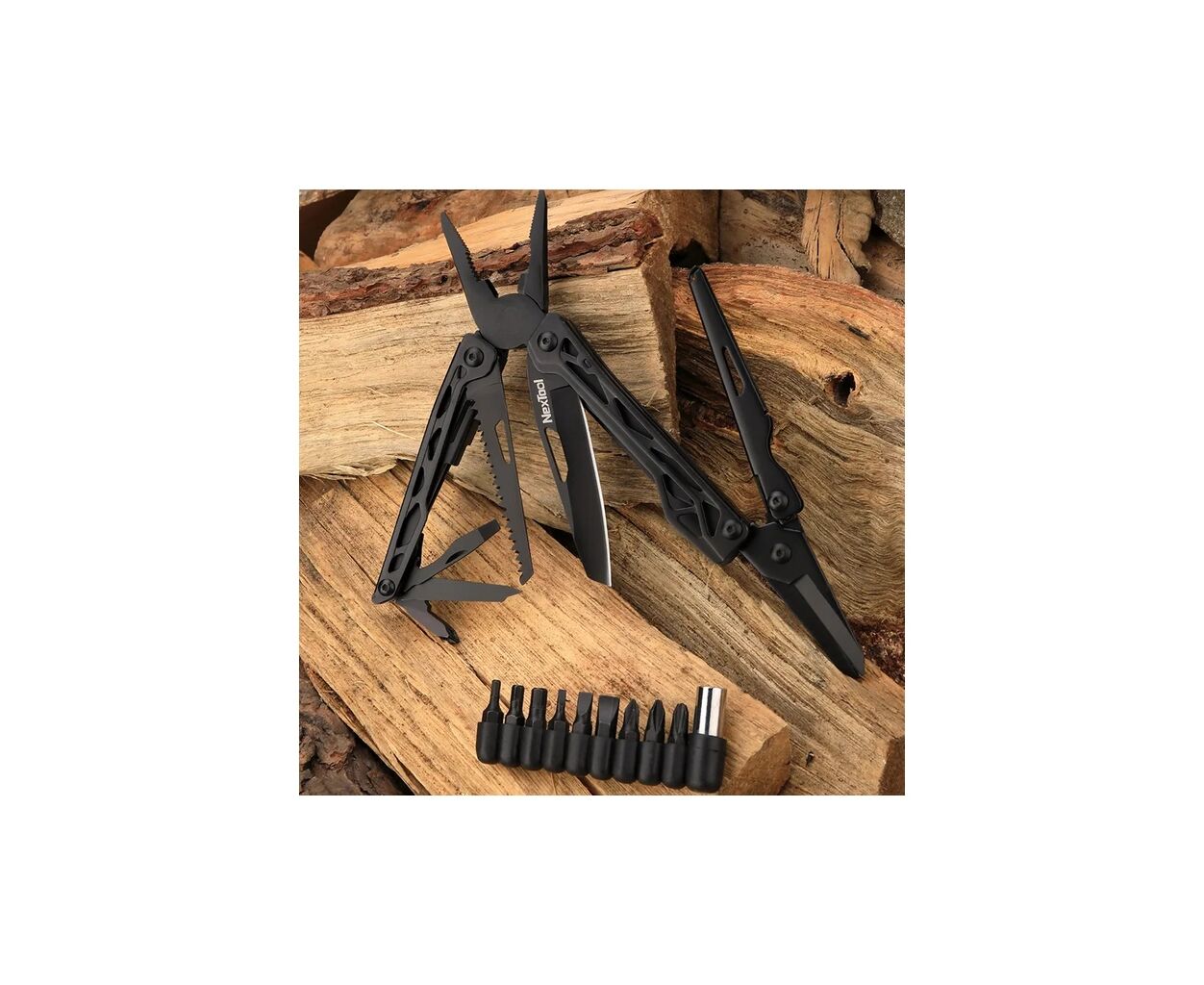 С размерами всего 106 мм в сложенном состоянии и весом 193.5 г, его чрезвычайно удобно носить каждый день. В комплект входит стильный нейлоновый чехол для ещё большего удобства в транспортировке. Особенностью этого мультитула является держатель с набором 9 бит популярных видов, что значительно усиливает его универсальность и подход к выполнению разнообразных задач.