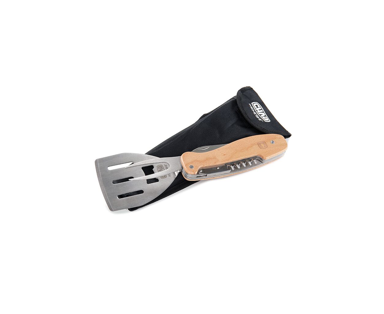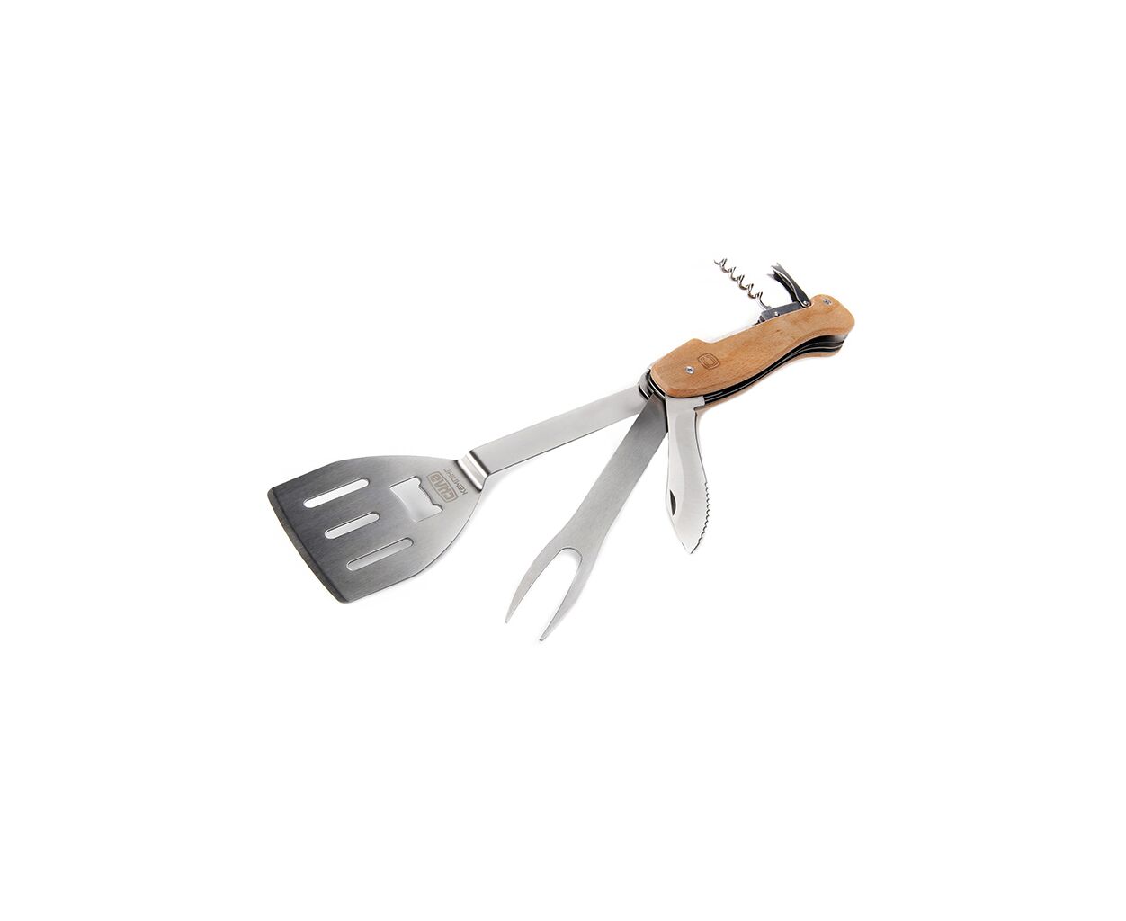 В комплекте вы найдете лопатку для гриля, вилку для барбекю, нож, штопор и открывалку для бутылок. Все эти инструменты объединены в одно компактное деревянное рукоятие, которое, помимо функционального удобства, добавляет эстетичности вашему оборудованию. Общая длина составляет 277 мм, что позволяет удобно хранить мультитул даже в кармане или рюкзаке, а его вес всего 325 г делает его чрезвычайно легким.