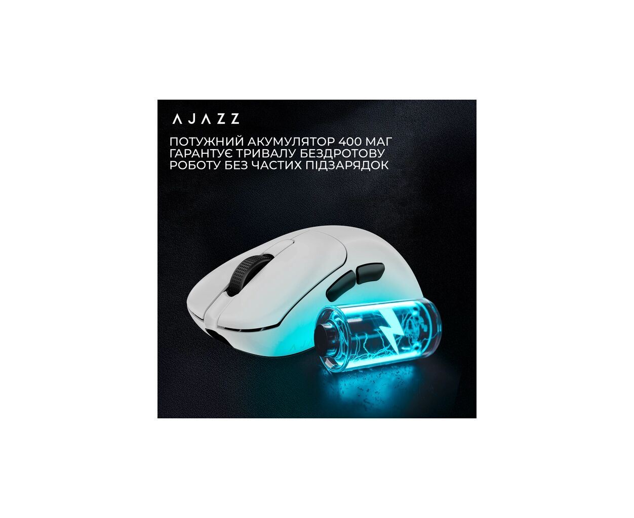 Мышь оснащена встроенным аккумулятором 400 мАч и использует технологию низкого энергопотребления от AJAZZ, что позволяет продлить время автономной работы — для длительных игровых сессий без частой подзарядки.