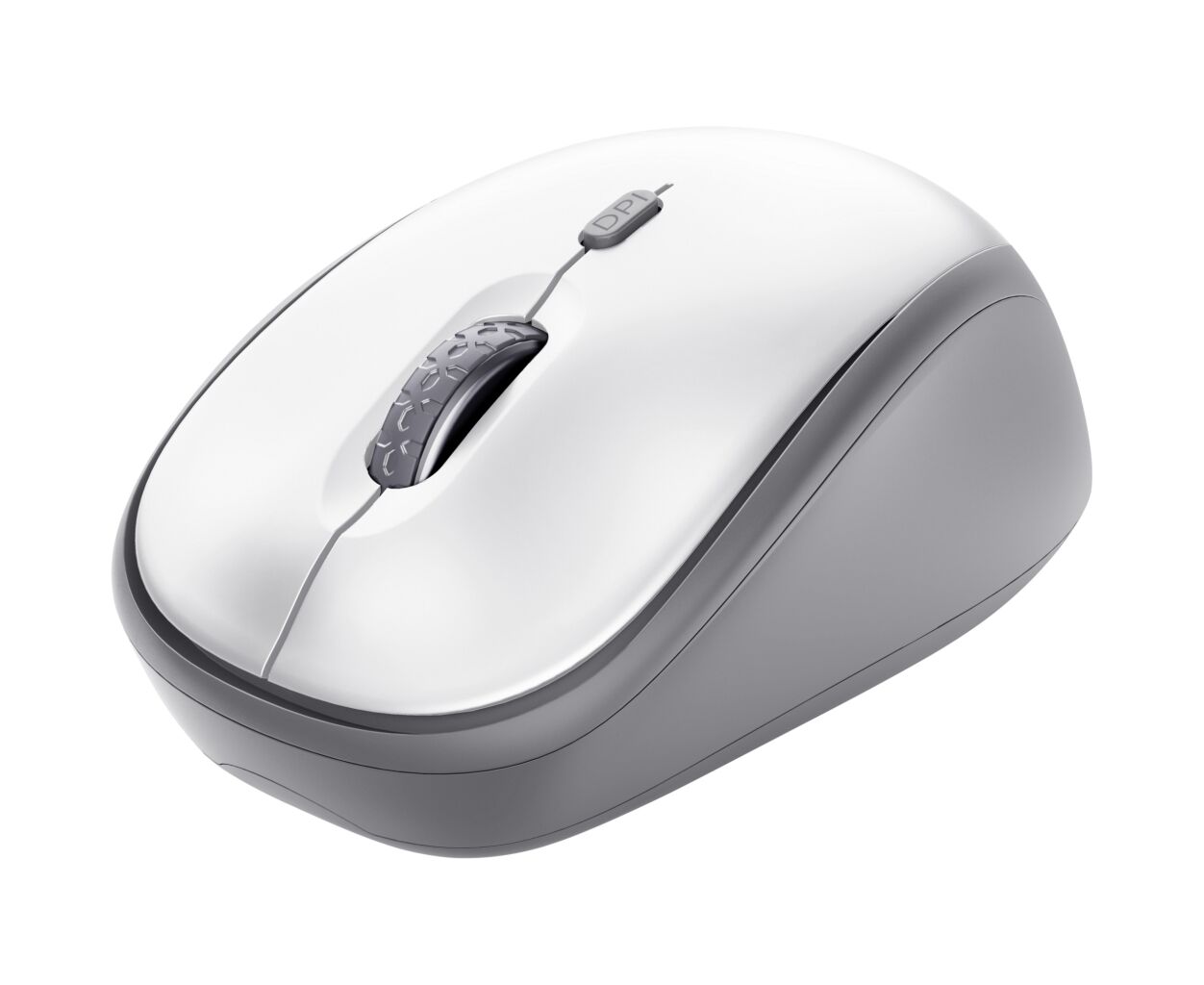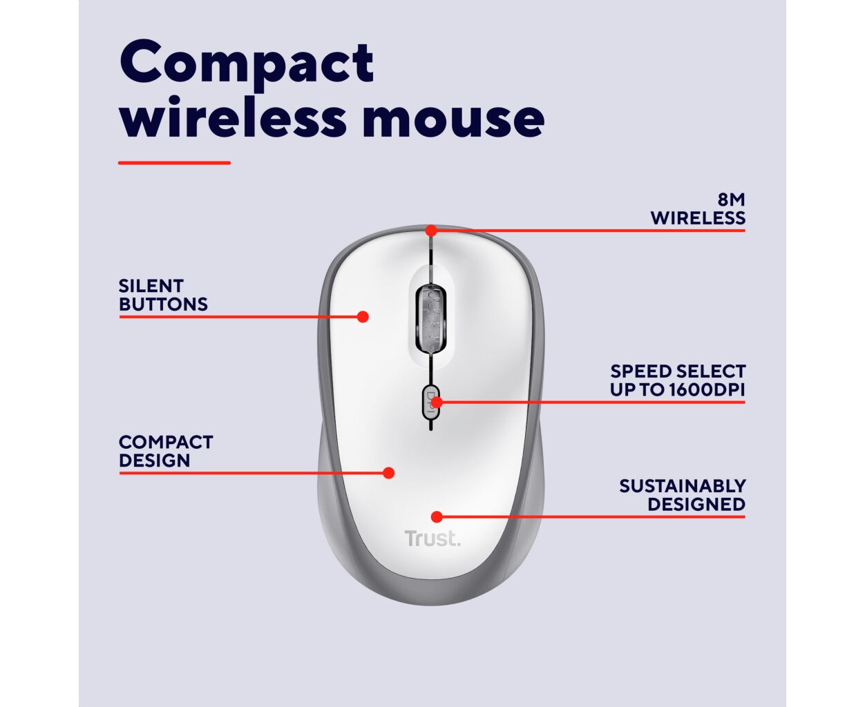 TRUST Yvi+ Silent Mouse — компактная беспроводная мышь с бесшумными кнопками; изготовлена из 82% переработанных материалов.