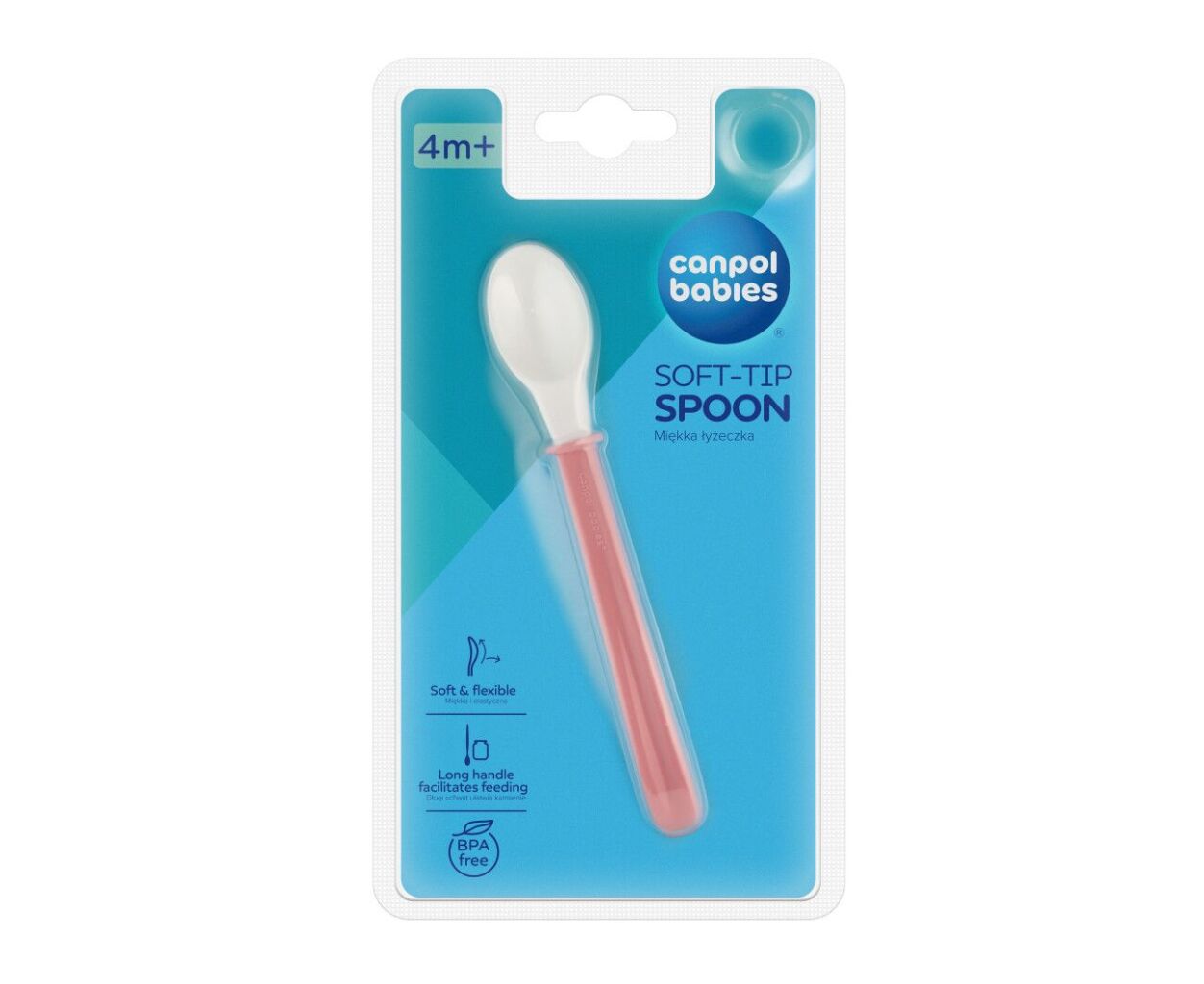 Гибкая ложка с длинной ручкой Canpol babies идеально подходит для начала введения прикорма, рекомендуется с 4-х месяцев. Ложка безопасна, а также пригодится при первых попытках самостоятельного приема пищи. Изготовлена ​​из безопасного пластика без содержания бисфенола и других вредных веществ - протестирована по поводу возможности контакта с пищевыми продуктами.