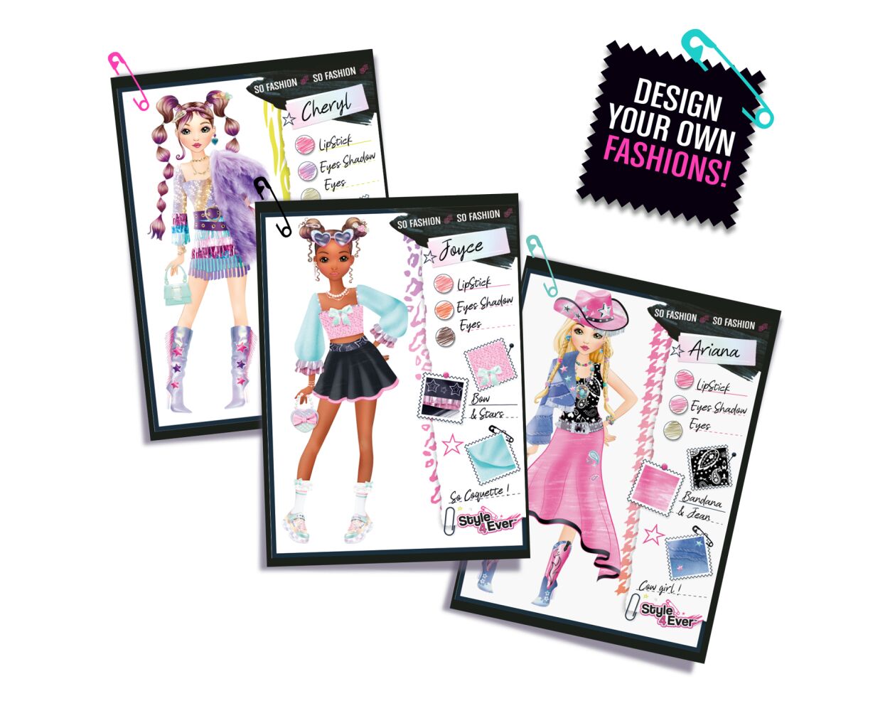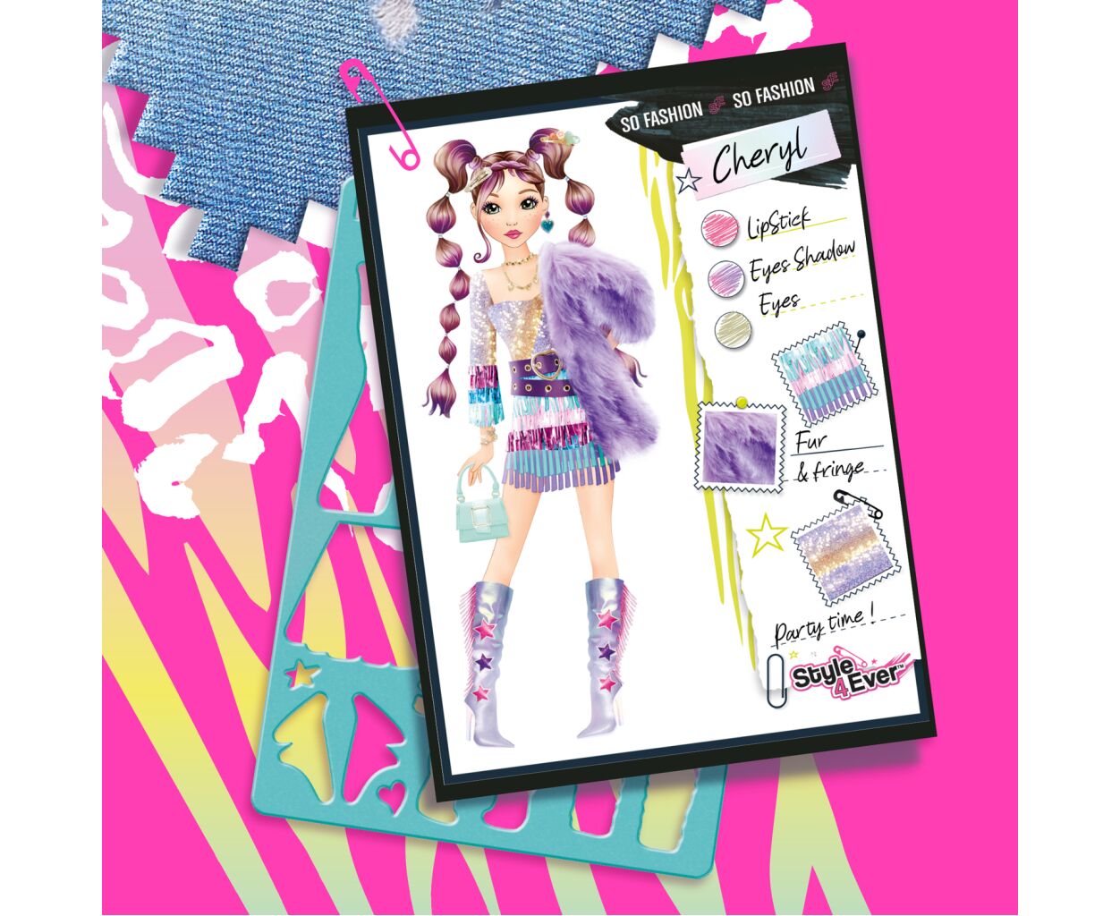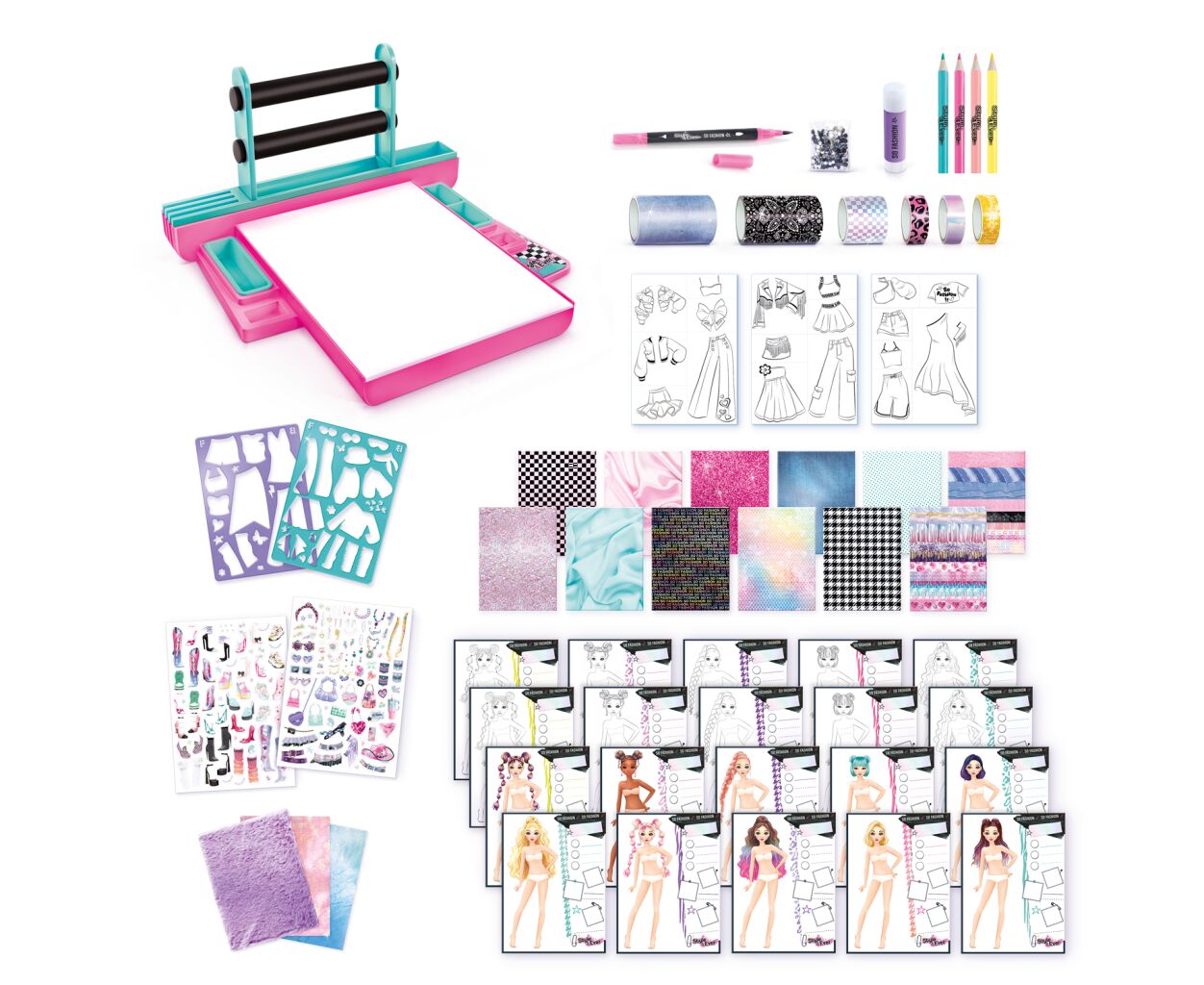• 1 фабрика с панелью с подсветкой, 20 постеров с изображением моделей, 2 пластиковых трафарета, 3 листа трафаретов, 2 листа с наклейками,12 печатных листов, 6 рулонов печатной бумаги, 4 цветных карандаша, 1 клей, 1 маркер, 1 пакетик со стразами, инструкция