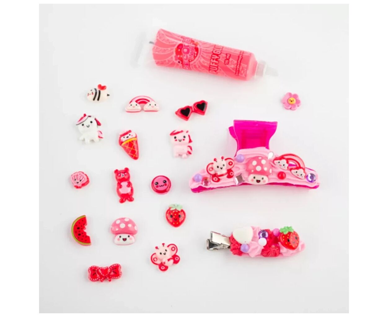 В набор входят разнообразные аксессуары, стразы, бусинки, фигурки и уникальный цветной клей, с помощью которого создаются неповторимые украшения, никогда не похожие между собой и сделанные с любовью.