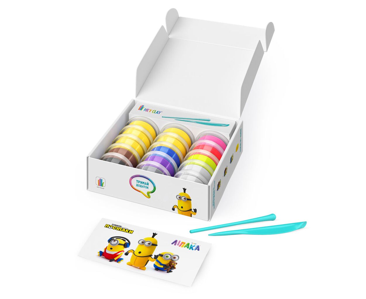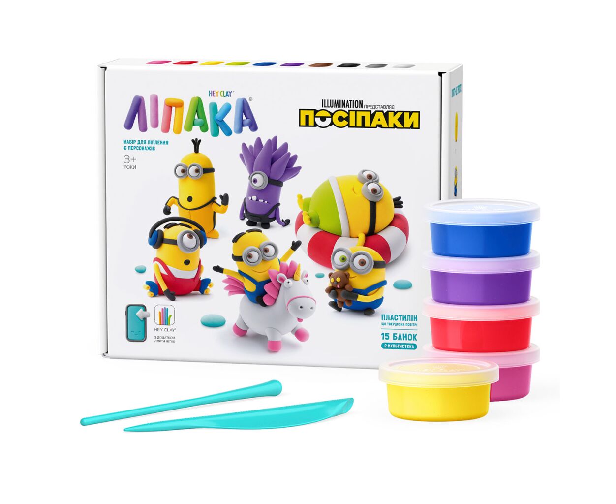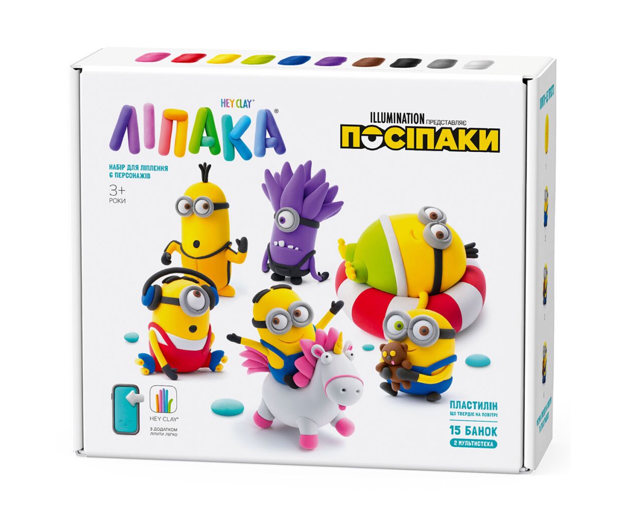 Меганабор пластилина самозатвердевающего пластилина ЛИПАКА - МИНЬОНЫ - развлечет и малышей и взрослых. С помощью анимационных инструкций в приложении HEY CLAY, Вы сможете слепить 6 уникальных персонажей: Кевина, Отто, Злого миньона, Стюарта, Дейва с Флаффи и Боба с Тином. Пластилин затвердевает на воздухе в течение 24 часов, после чего можно играть созданными фигурками.