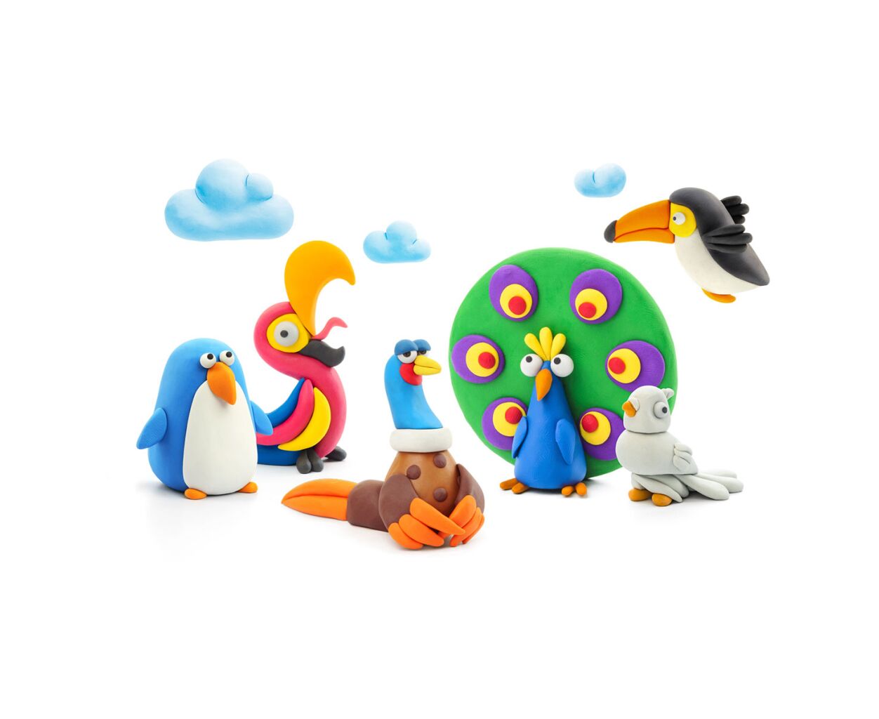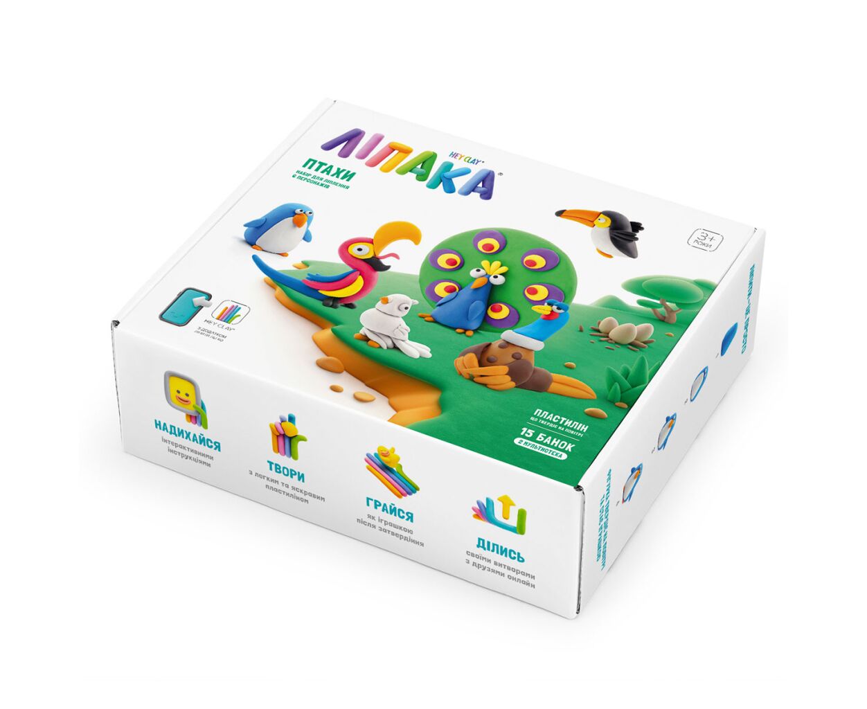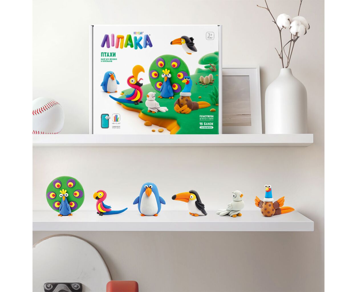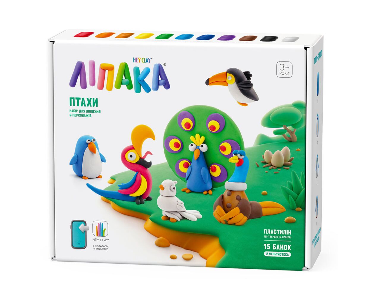 Меганабор пластилина самозатвердевающего пластилина ЛИПАКА - ПТИЦЫ - развлечет и малышей и взрослых. С помощью анимационных инструкций в приложении HEY CLAY, Вы сможете слепить 6 уникальных персонажей: Пингвина, Попугая Ара, Голубя, Фазана, Павлина и Тукана. Пластилин затвердевает на воздухе в течение 24 часов, после чего можно играть созданными фигурками.