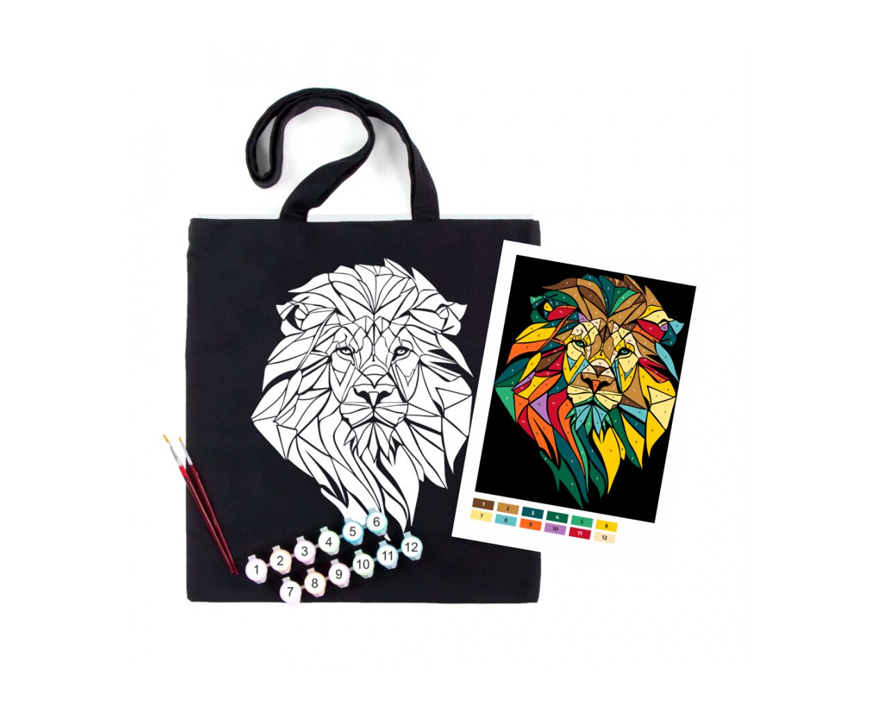 • екосумка с нанесенным контуром рисунка, краски акриловые для тканей Rosa Talent, кисти художественные, цветная схема, прозрачный пакет, этикетка с пошаговой инструкцией на обороте
