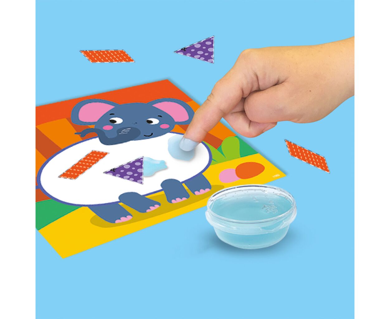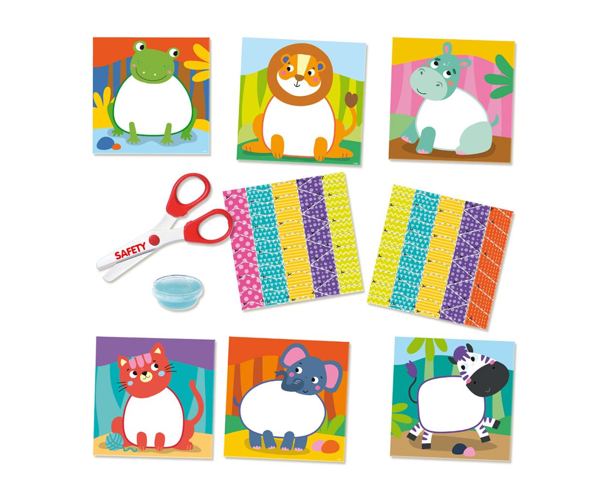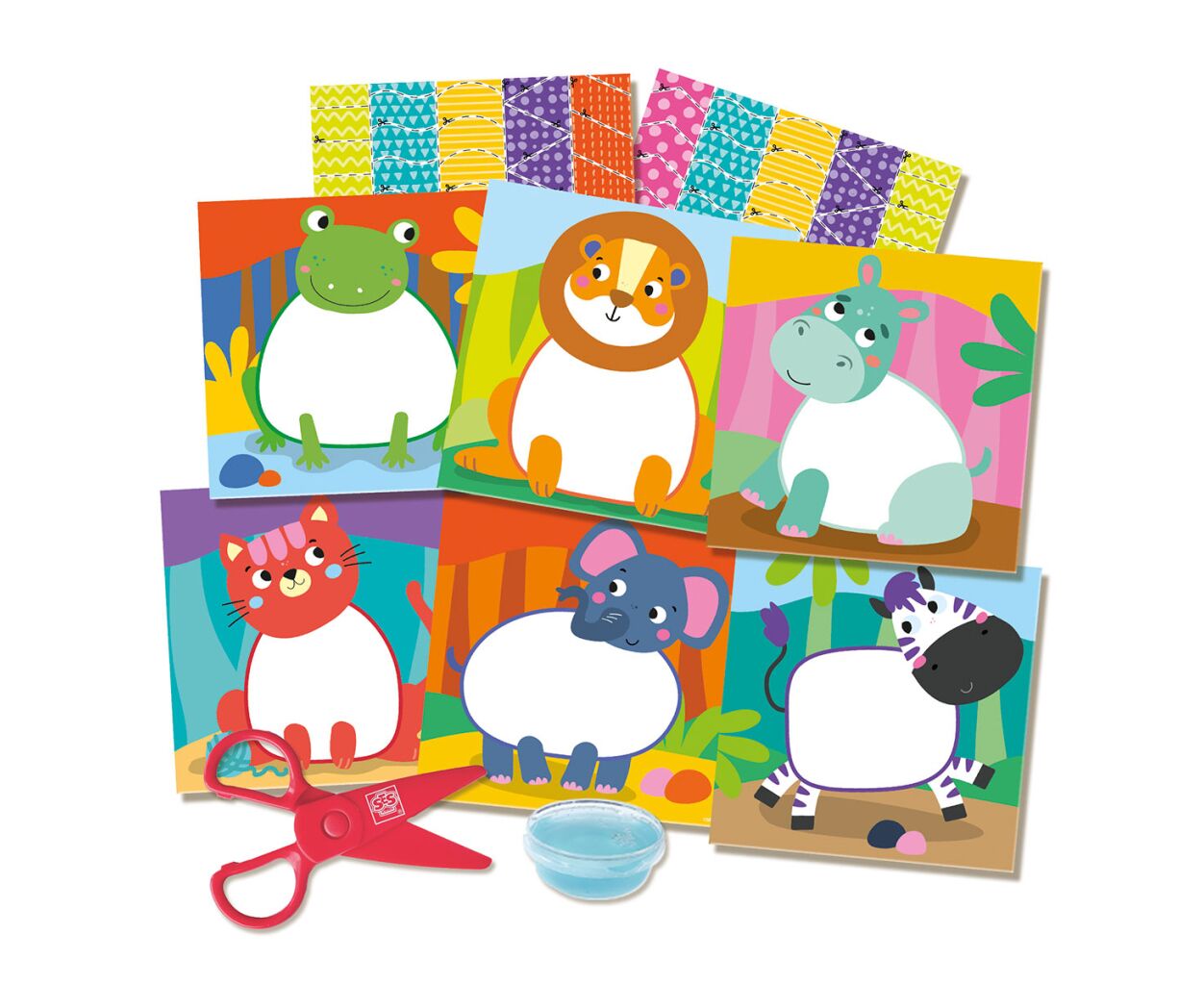 - 6 карточек с животными для наклеивания; 2 шаблона для вырезания базовых форм; ножницы; пальчиковый кл