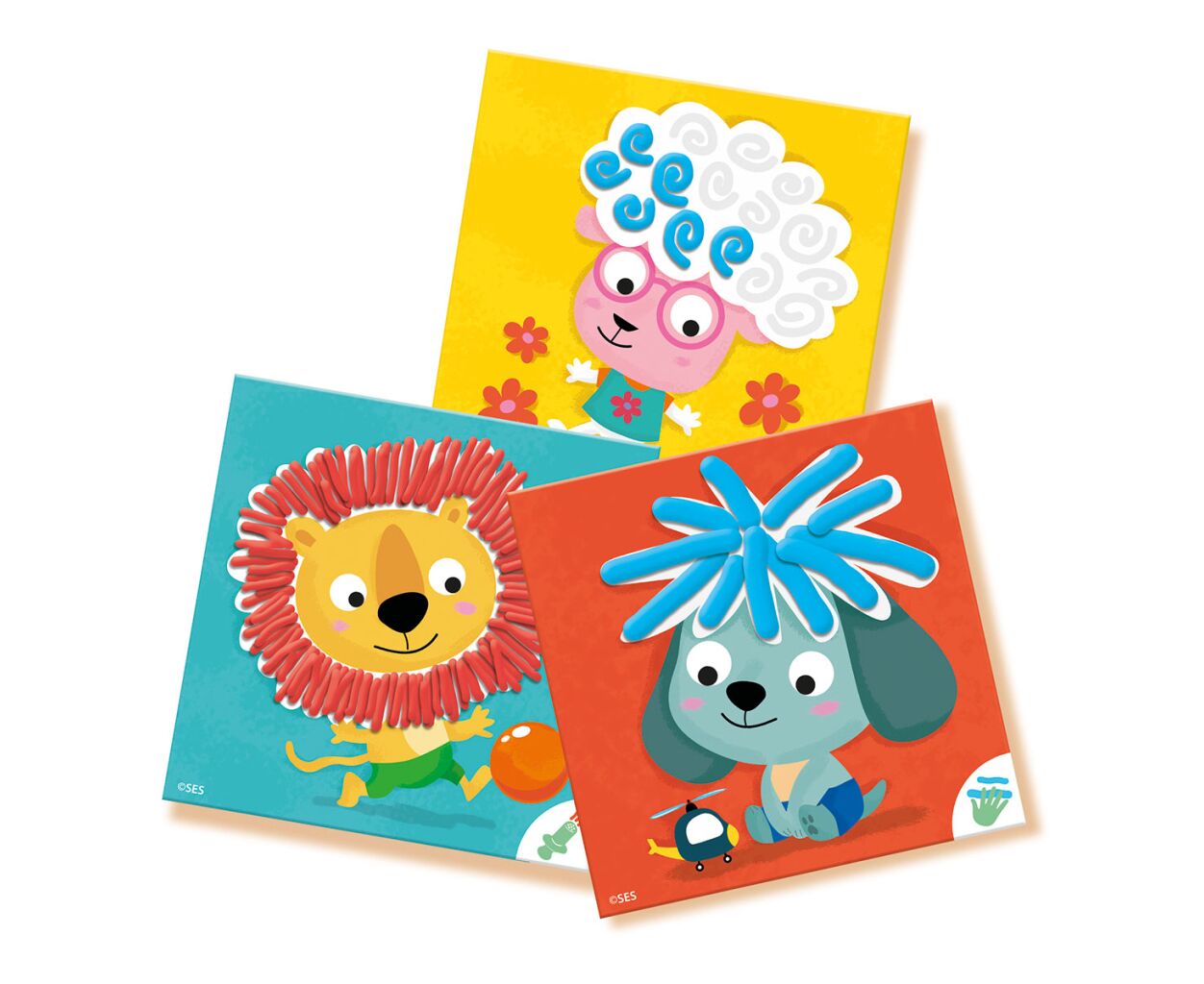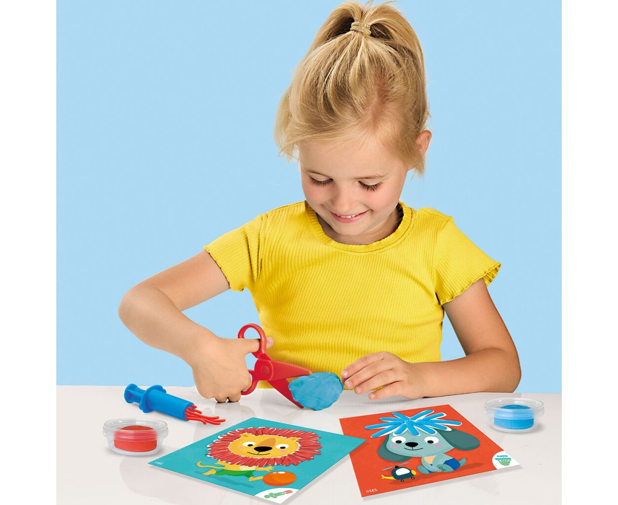 • 4 многоразовые карточки с животными, 2 баночки с массой для лепки по 40 г (голубая и красная), пре