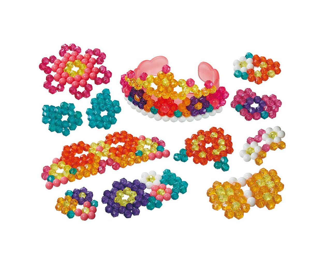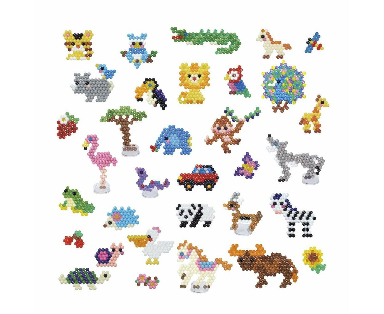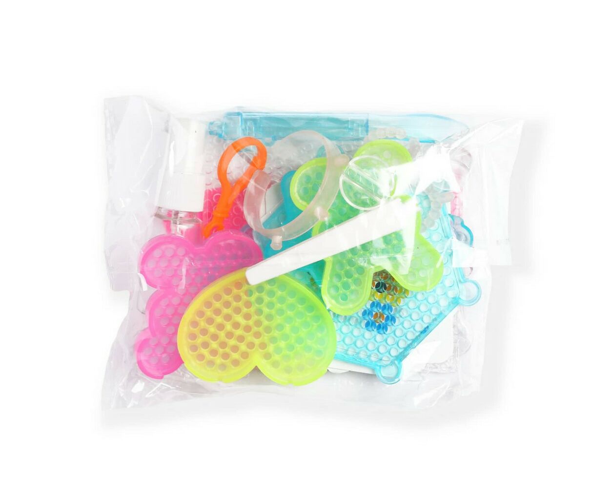 В набор аксессуаров входят 26 предметов: трафареты с уже готовыми поделками, пинцеты, специальная емкость для воды, подставки разной геометрической формы и площади, лопатка и карабины для браслетов и колечек.