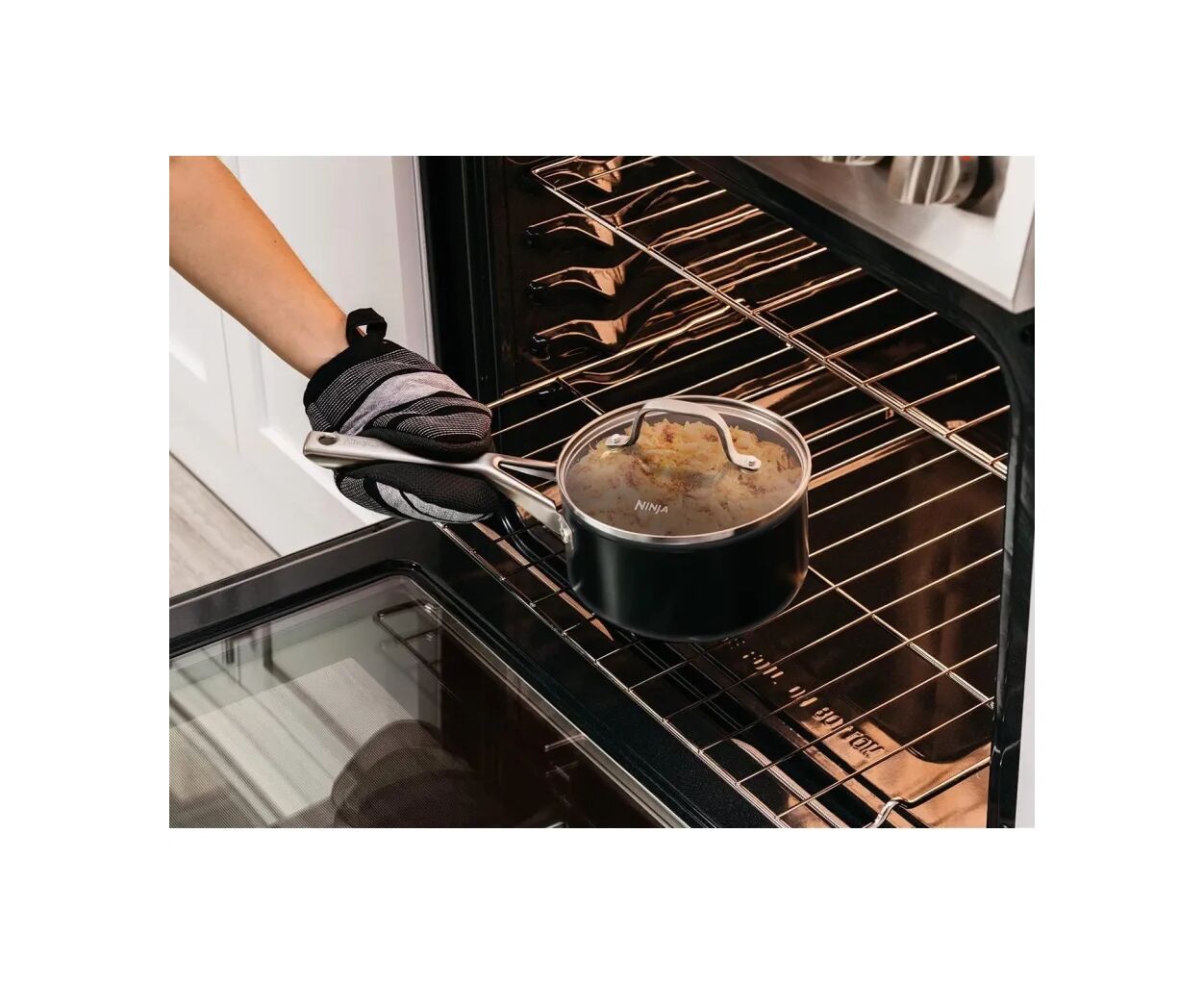 Ручки из нержавеющей стали остаются холодными во время приготовления, поэтому кастрюлю легко переставлять с плиты в духовку. Посуда Ninja совместима со всеми типами плит, выдерживает температуру до 260 °C и легко моется в посудомоечной машине.