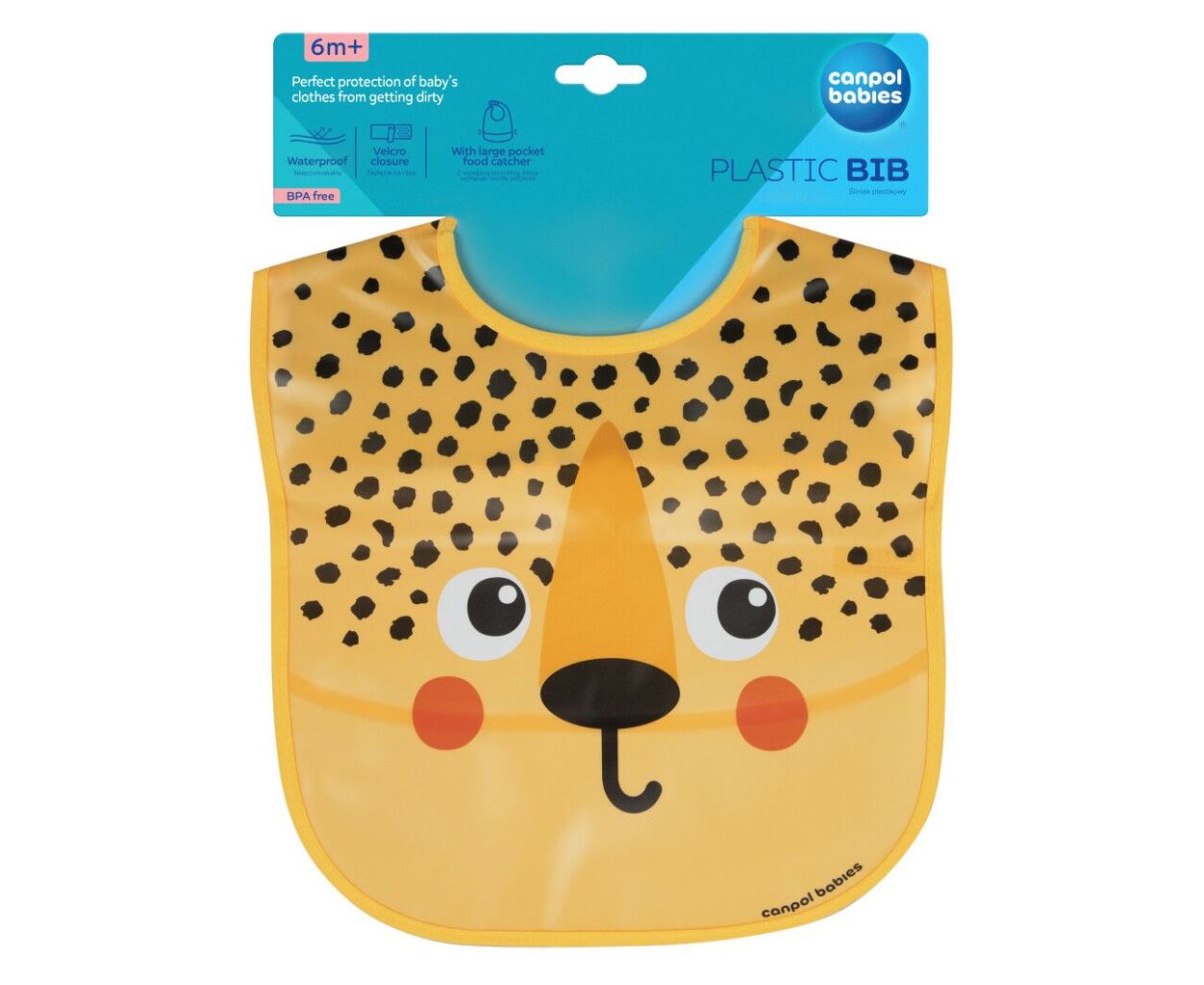 Описание Нагрудничек Canpol babies Hello Little - гепард, пластмасовий з кишенькою (9/232_ora2)