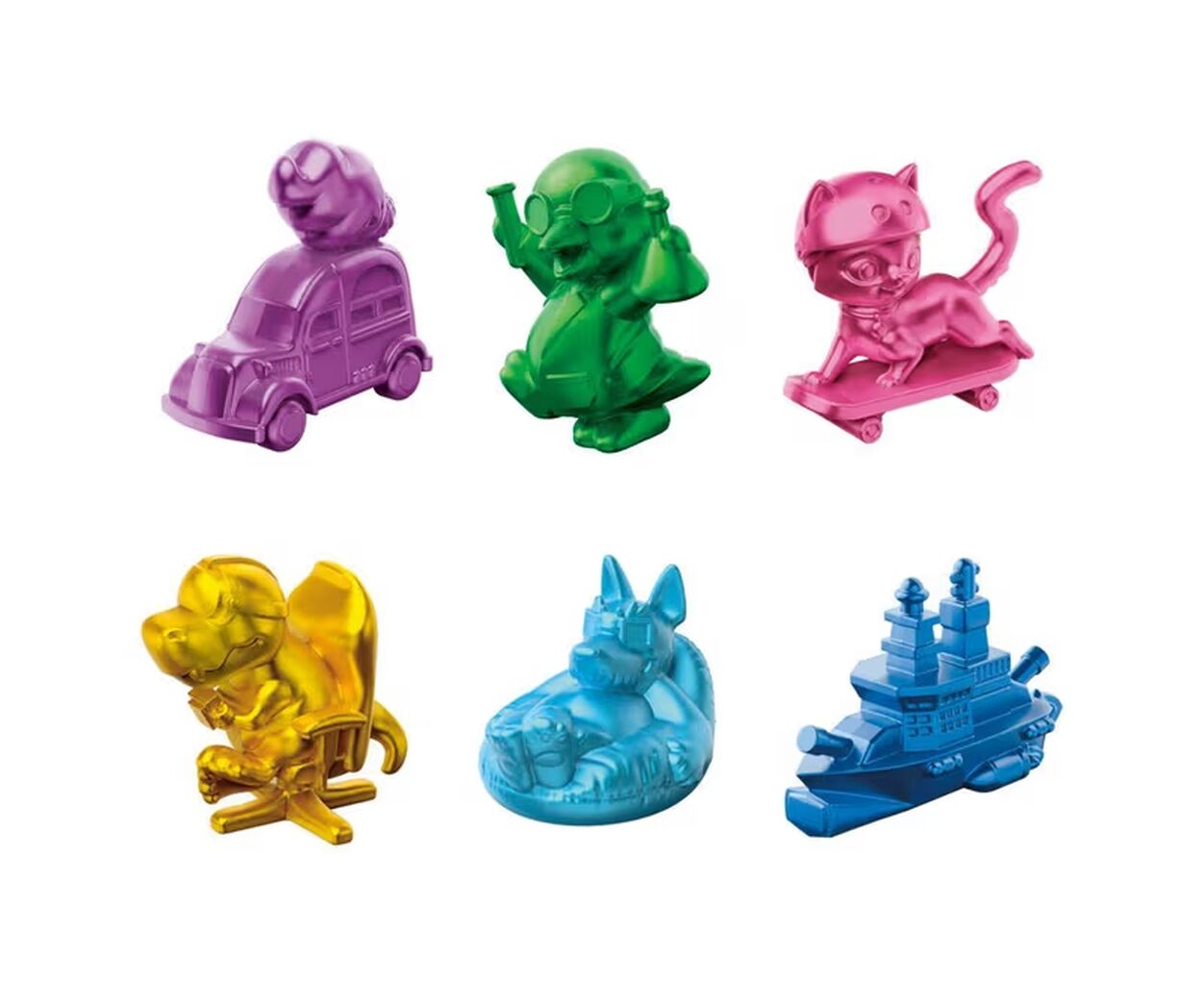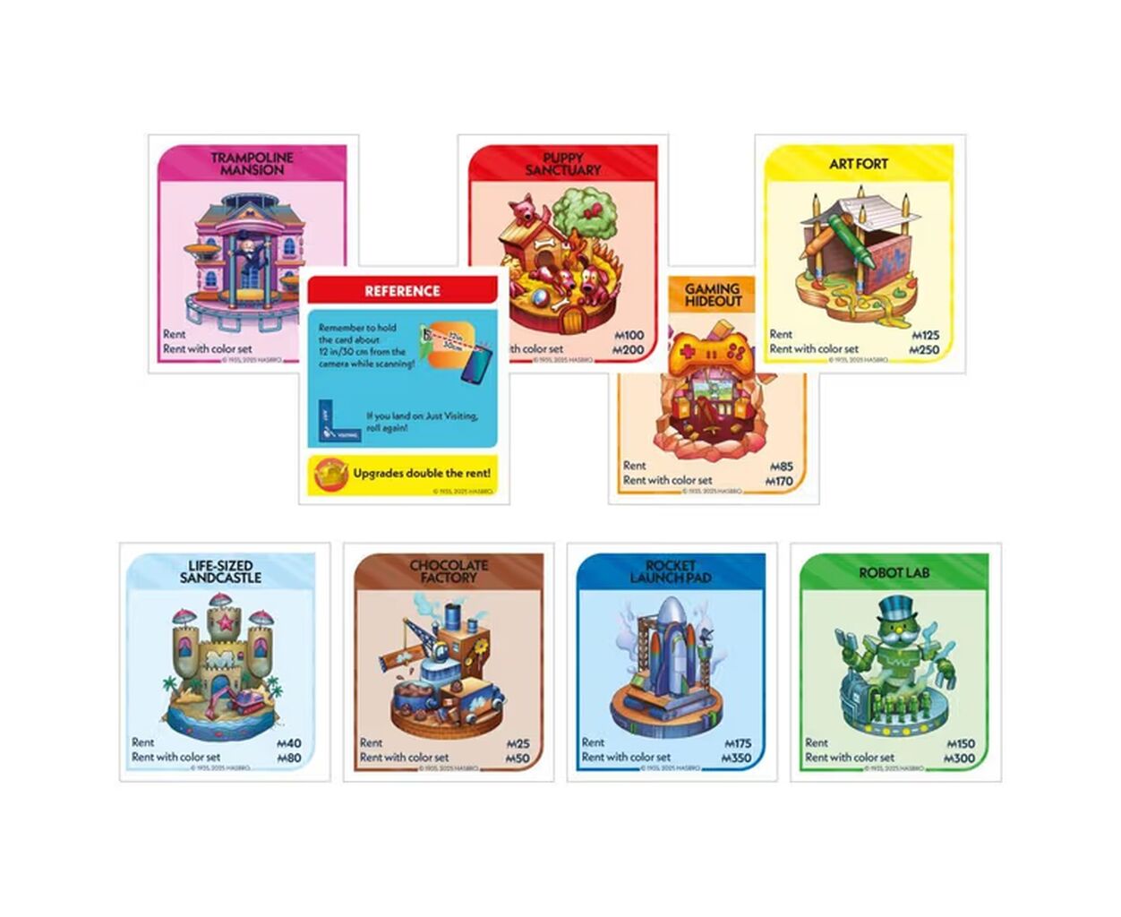 • игровое поле, 2 игральных кубика, пластиковую подставку для устройств, 6 жетонов, 6 банковских карт, 6 пластиковых корон улучшений, 22 карточки права собственности, 2 справочные карты, 6 карт действий