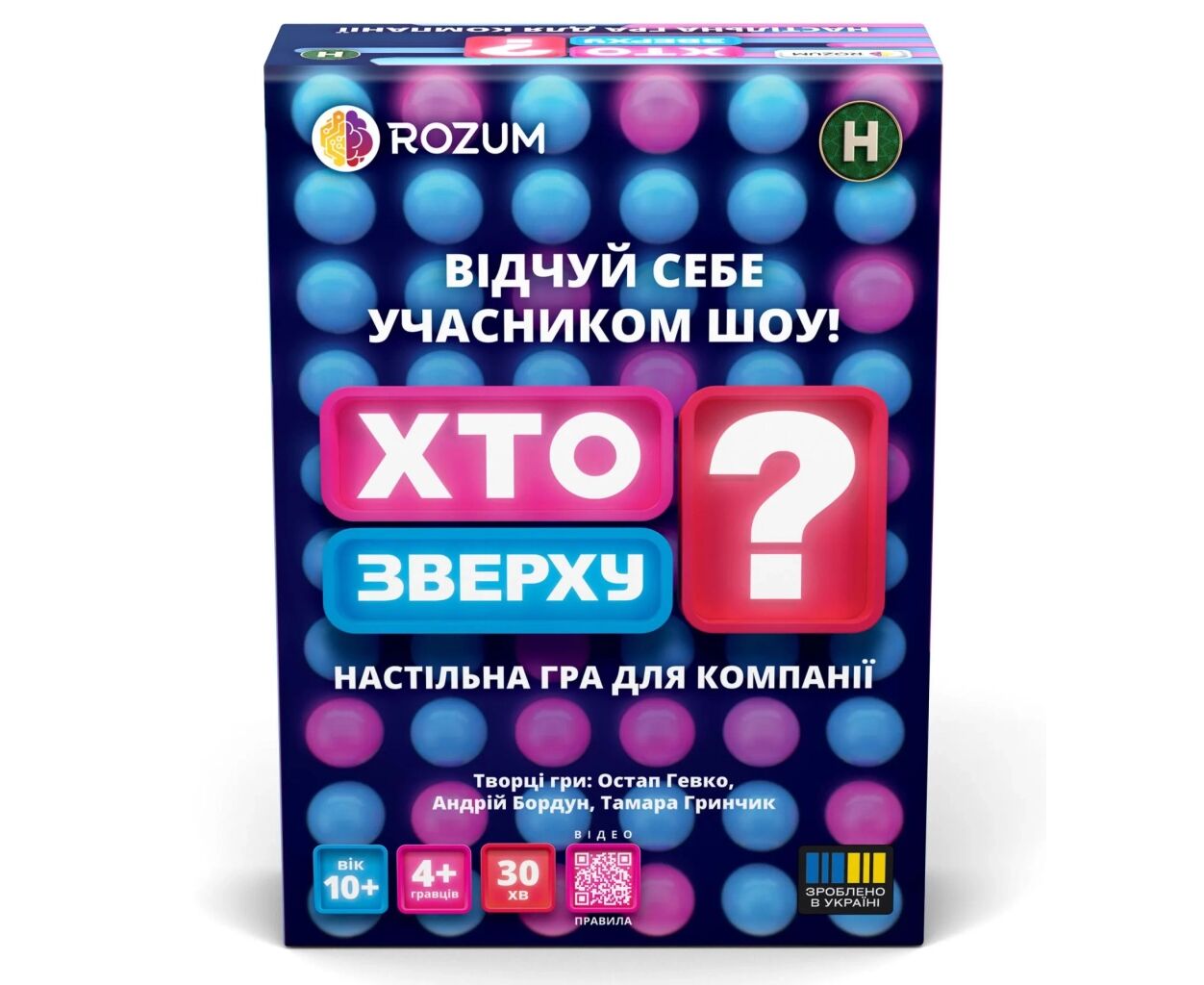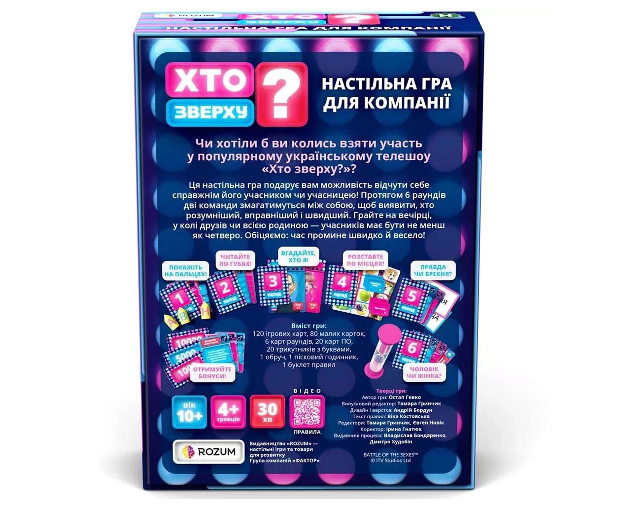 Каждый в Украине знает такое шоу, как "Кто Сверху?" Эта легендарная телепрограмма с 2012 года позволяет увидеть звезд шоу-бизнеса в игровых ситуациях. Но представляли ли вы себя когда-нибудь на месте звезд? Хотели бы почувствовать себя участником шоу? Настольная игра «Кто сверху?» — это адаптация телепрограммы "на стол", где вы вместе с друзьями или семьей соревнуетесь в 6 разных раундах! Эта игра гарантирует незабываемые эмоции, интересные задачи и море смеха, ведь это адаптация популярного мирового телевизионного формата Battle of the Sexes.