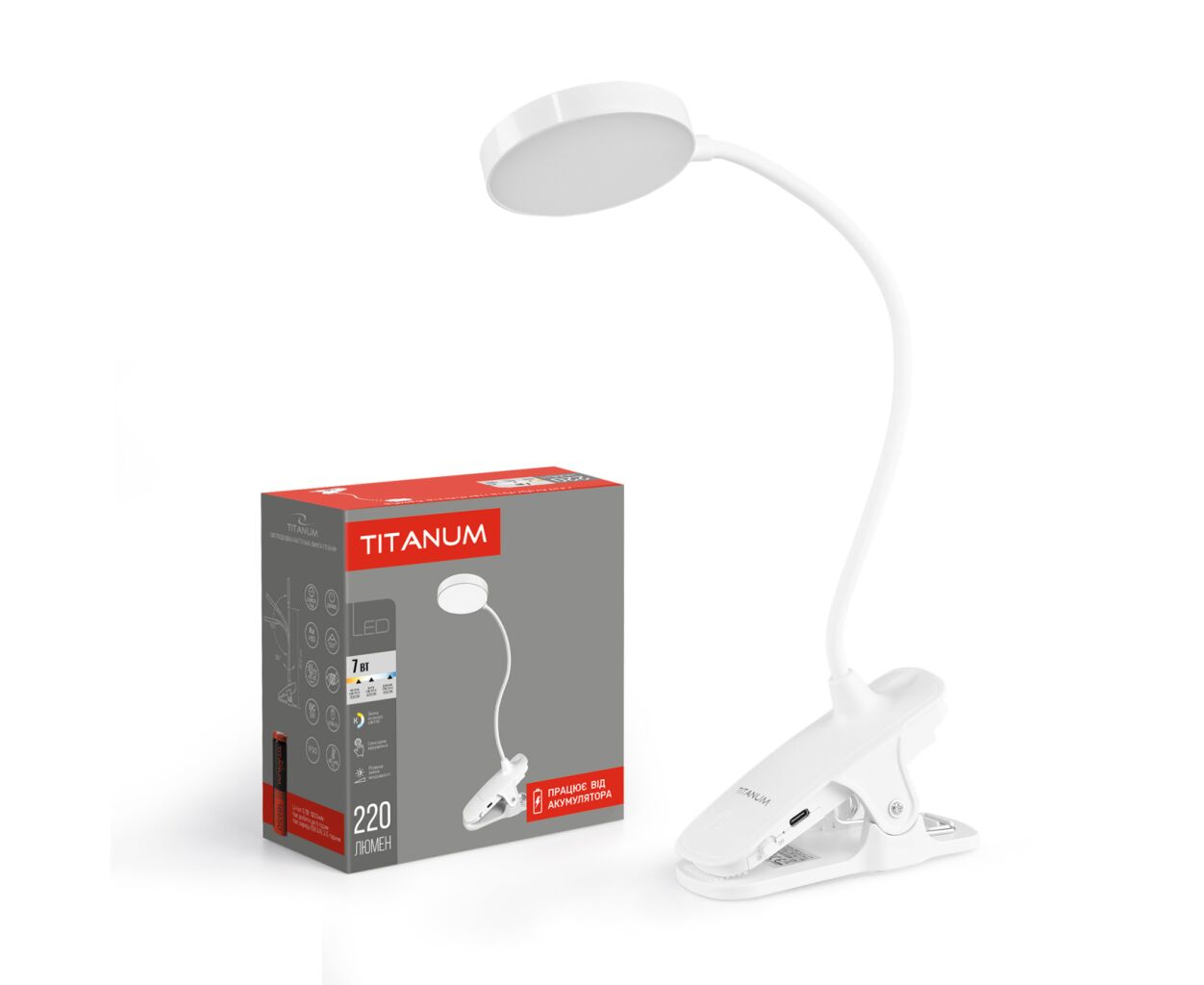 LED настольная лампа с аккумулятором TITANUM TLTF-013W 7W 3000-6000K – стильная, удобная и компактная лампа с возможностью регулировки яркости и цветности. Она крепится на столе, книжной полочке или другой плоской поверхности с помощью прививочного мехаизма. Лампа абсолютно бесшумная, имеет встроенный аккумулятор и длительный срок службы. Корпус изготовлен из экологически безопасного качественного пластика белого цвета. Подвижная конструкция ножки лампы позволяет направлять свет в нужном направлении. Рассчитана для освещения письменной или рабочей зоны. Реализована возможность регулировки яркости и изменения цветности света, что способствует уменьшению нагрузки на зрение. Управление лампой производится с помощью сенсорной кнопки, расположенной на ее корпусе.