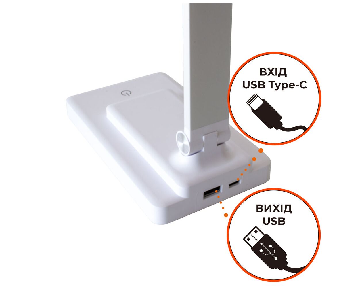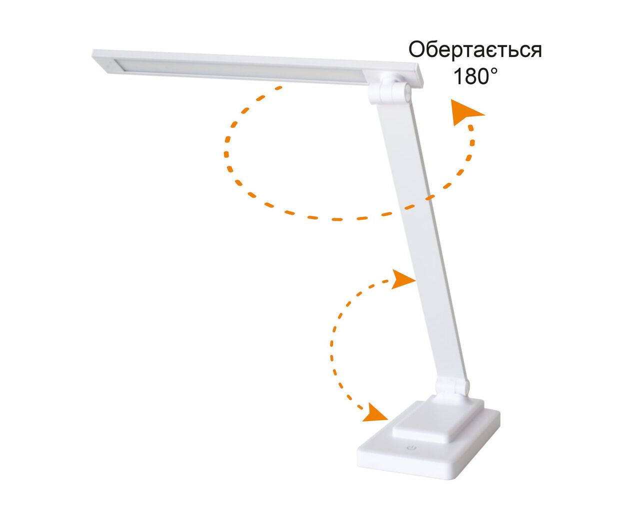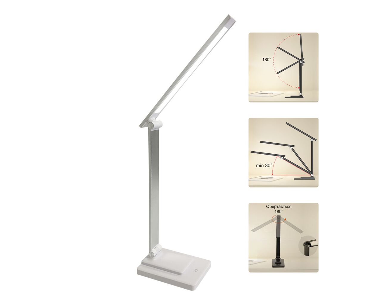 Стиль - модерн, Вид лампы - офисные, Тип лампы - LED-лента, Крепление - подставка, встроенная (незаменяемая), Выключатель - сенсорный, нет, есть, Материал - пластик, Цвет - белый