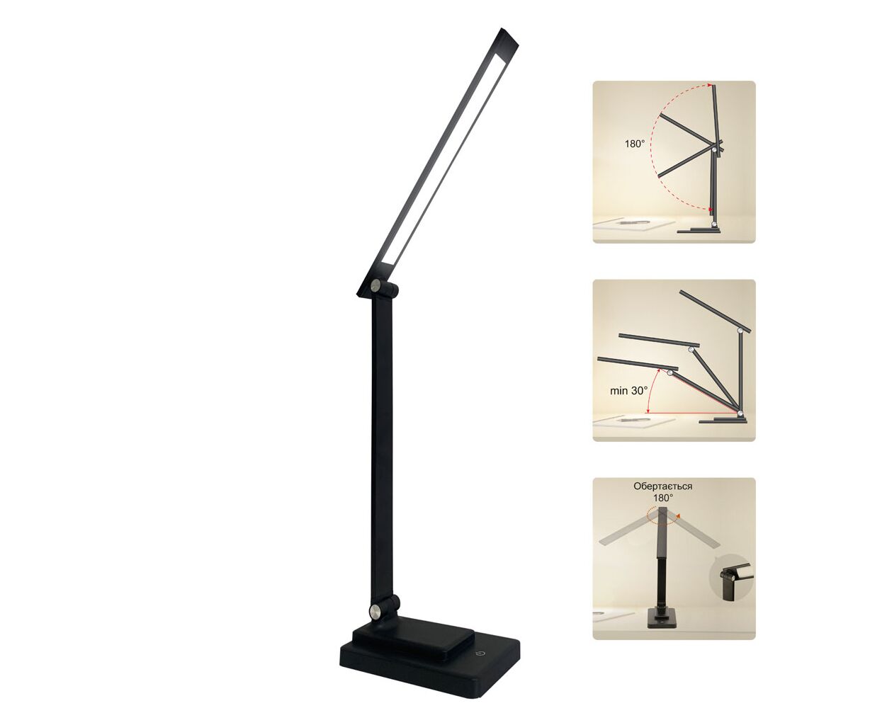 Стиль - модерн, Вид лампы - офисные, Тип лампы - LED-лента, Крепление - подставка, встроенная (незаменяемая), Выключатель - сенсорный, нет, есть, Материал - пластик, Цвет - черный