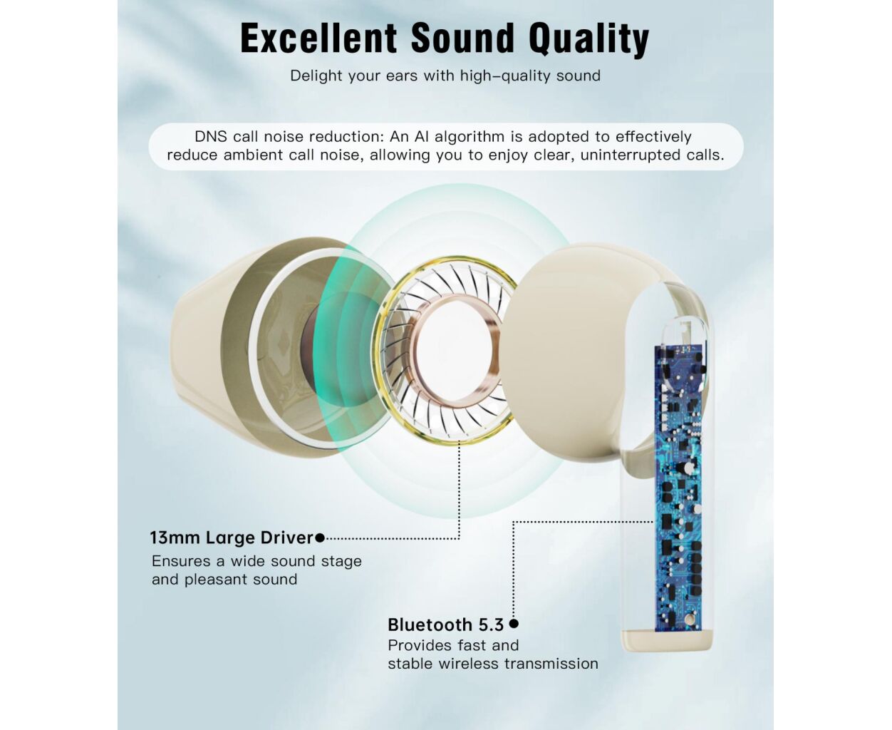 Навушники бездротові TWS Oval світло-бежеві Choetech (BH-T24-SK) опис Навушники TWS Choetech BH-T24 - це ідеальне поєднання сучасних технологій, елегантності та комфорту. Вони роблять кожну мить, проведену за прослуховуванням музики або розмовою по телефону, більш комфортною та приємною. Стильний світло-бежевий колір додає їм елегантності, а передові технології забезпечують чудове звучання. Оснащені Bluetooth 5.3, вони забезпечують стабільне бездротове з'єднання та високу якість звуку. Ергономічний дизайн і міцна конструкція з екологічно чистих матеріалів роблять їх ідеальним вибором для активних людей, які шукають надійні навушники для повсякденного використання.