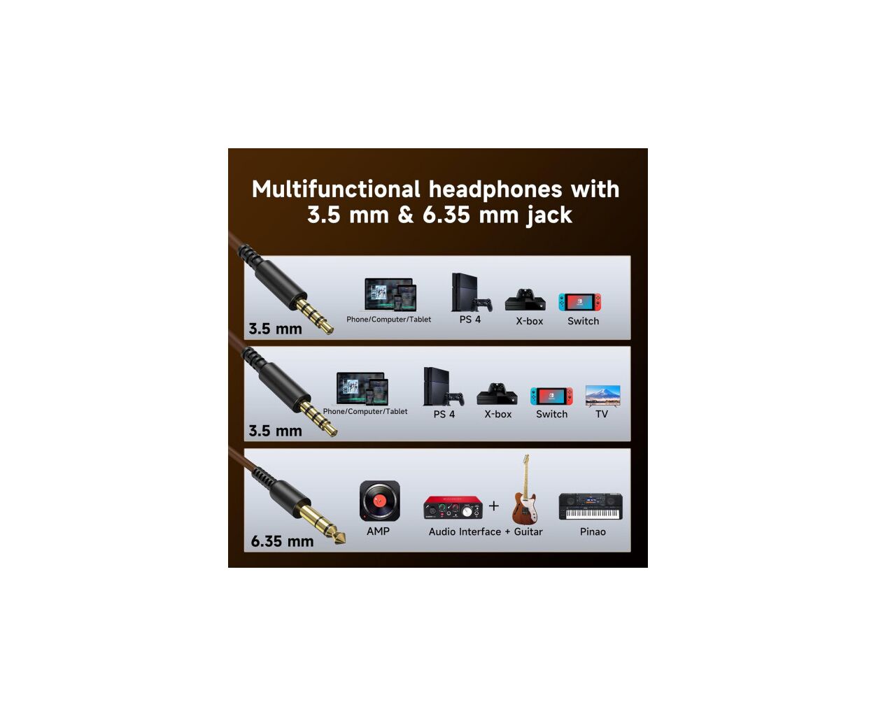 Два аудиовхода – 3.5 мм и 6.35 мм – позволяют подключать гарнитуру ко всем видам аналоговых источников звука. Она поддерживает подключение одновременно к двум аналоговым источникам. Позолоченные штекеры кабеля 3.5 мм→6.35 мм обеспечивают идеальную передачу аудиосигнала без потерь качества.