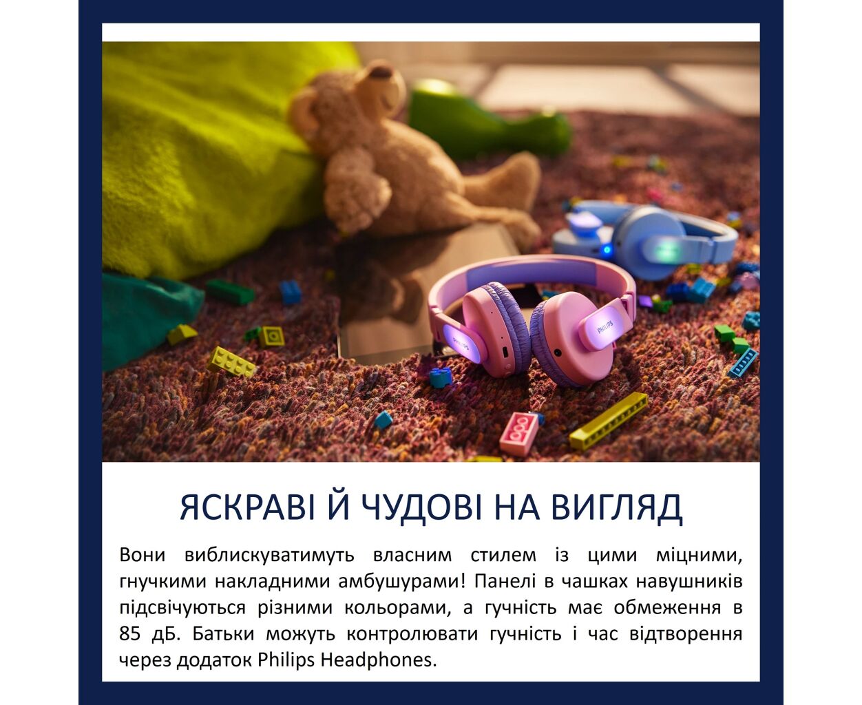 Эти надежные и настраиваемые накладные наушники станут частью стильного образа! Световые панели в чашках наушников горят ярким светом, а для звука установлена предельная громкость 85 дБ. Родители смогут управлять громкостью и временем игры через приложение Philips Headphones.