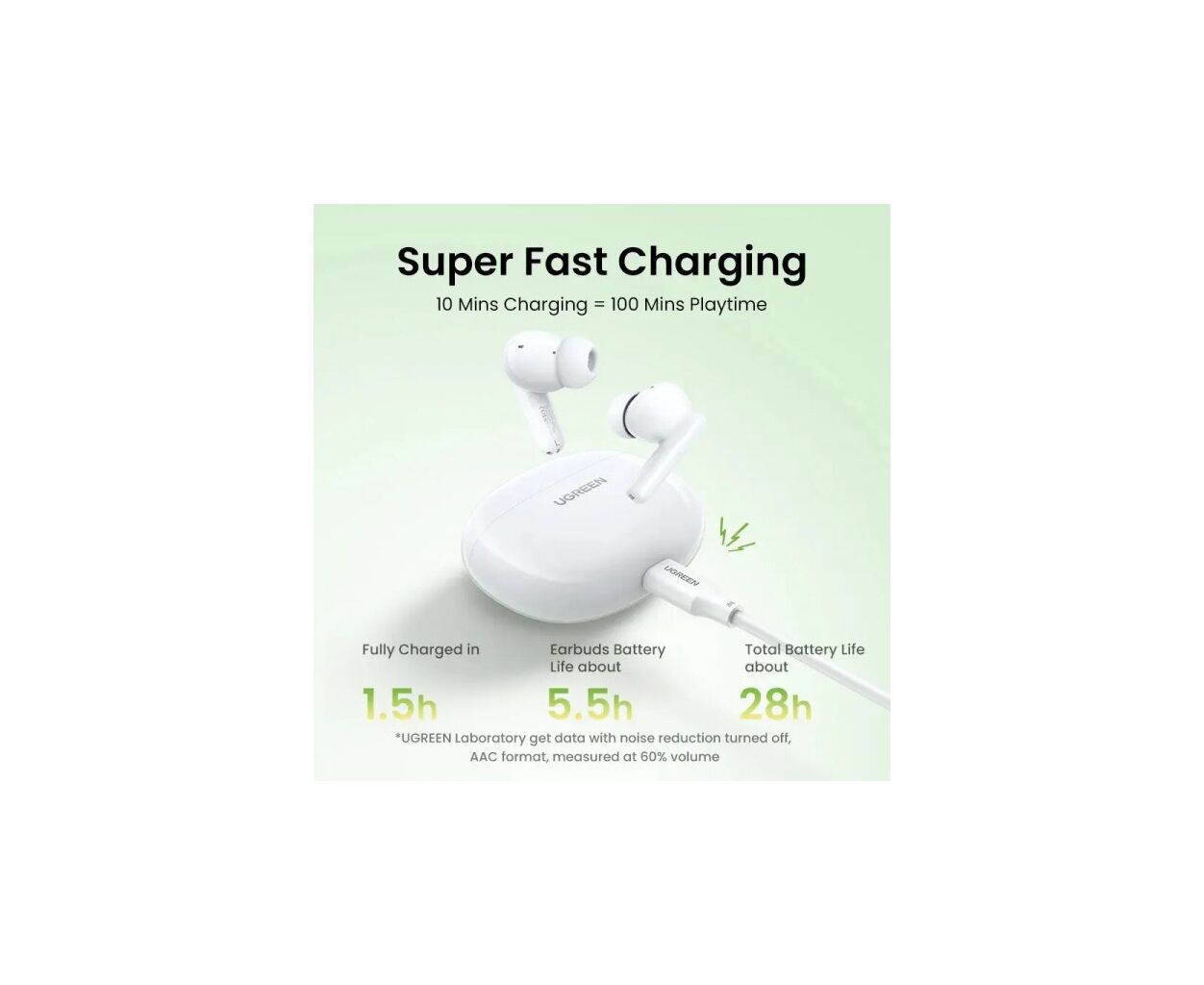 Одного заряду UGREEN HiTune T3C Earbuds із зарядним футляром вистачає до 30 години прослуховування. Заряд самих навушників тримається до 5,5 годин, а для повного їх заряджання знадобиться не більше 1,5 години. Швидке заряджання навушників впродовж 10 хвилин забезпечує до 100 хвилин прослуховування.