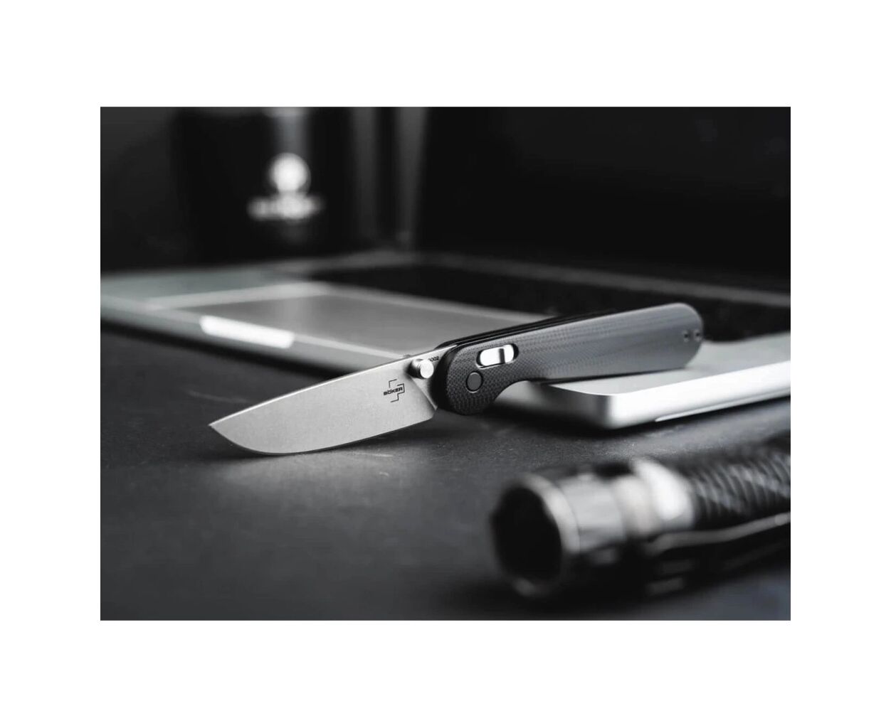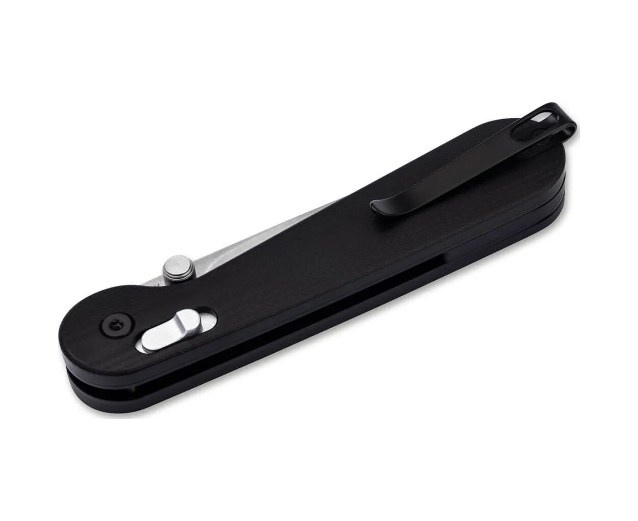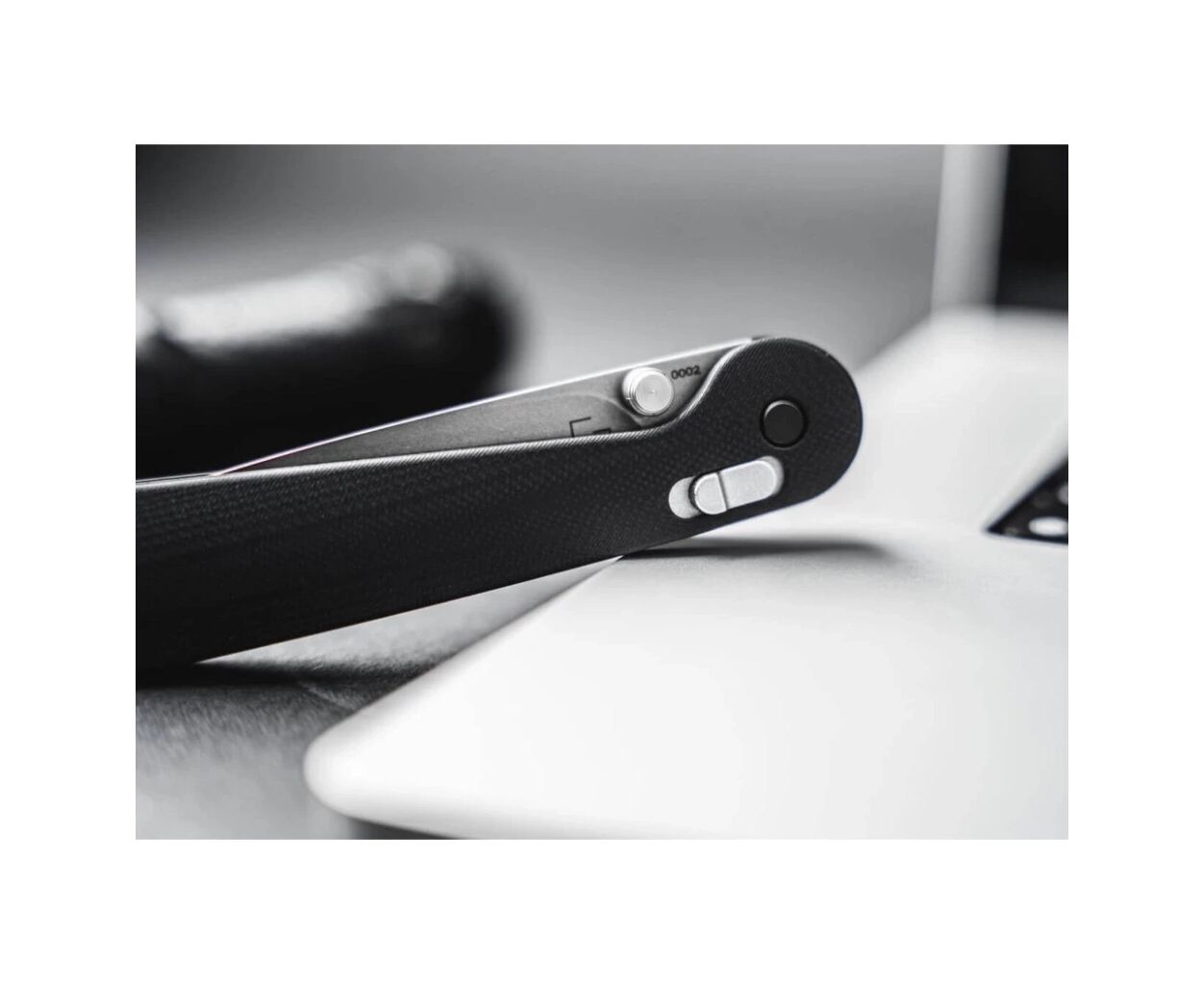 Лезвие на шарикоподшипнике типа drop-point с сатинированной отделкой из удерживающей заточку стали марки Nitro-V скользит по коробкам, веревкам или упаковке с мощной грацией, а эргономичная рукоятка из G10, отделанная в изысканном черном цвете, как и бэкспейсер и винт оси лезвия, олицетворяет уверенность в себе и надежно лежит в руке.
