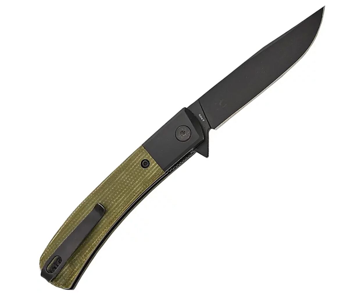 Рукоятка инструмента произведена из зеленой Микарты и имеет черный больстер, чем гармонично дополняет дизайн всего ножа.