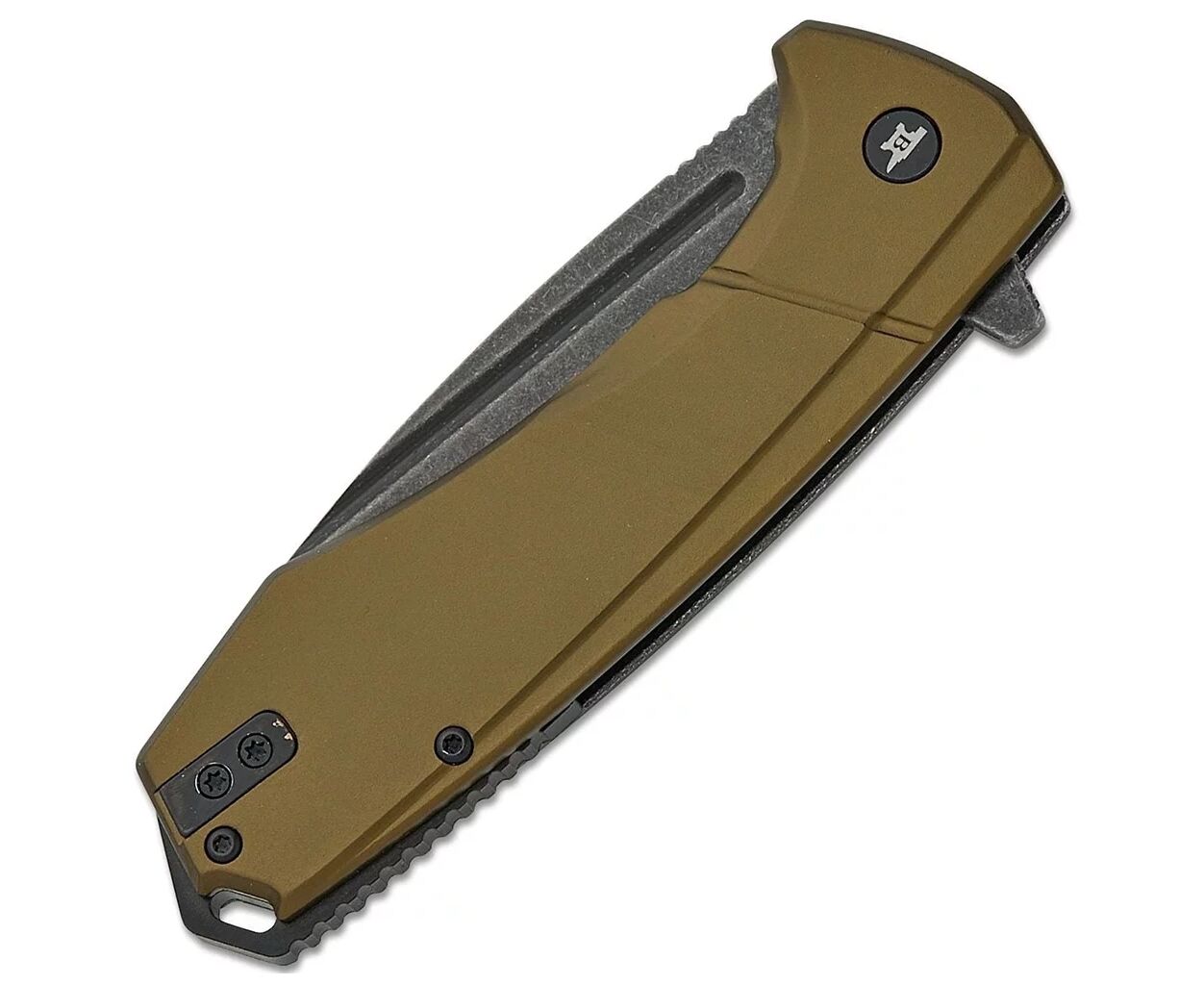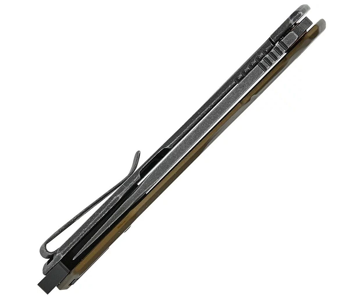 Рукоять выполнена из прочного и лёгкого материала G10 с эргономичной формой и текстурированной поверхностью для надёжного хвата в любых условиях. Нож оснащён удобным механизмом открывания с помощью флиппера и надёжным лайнерлоком для безопасного использования.