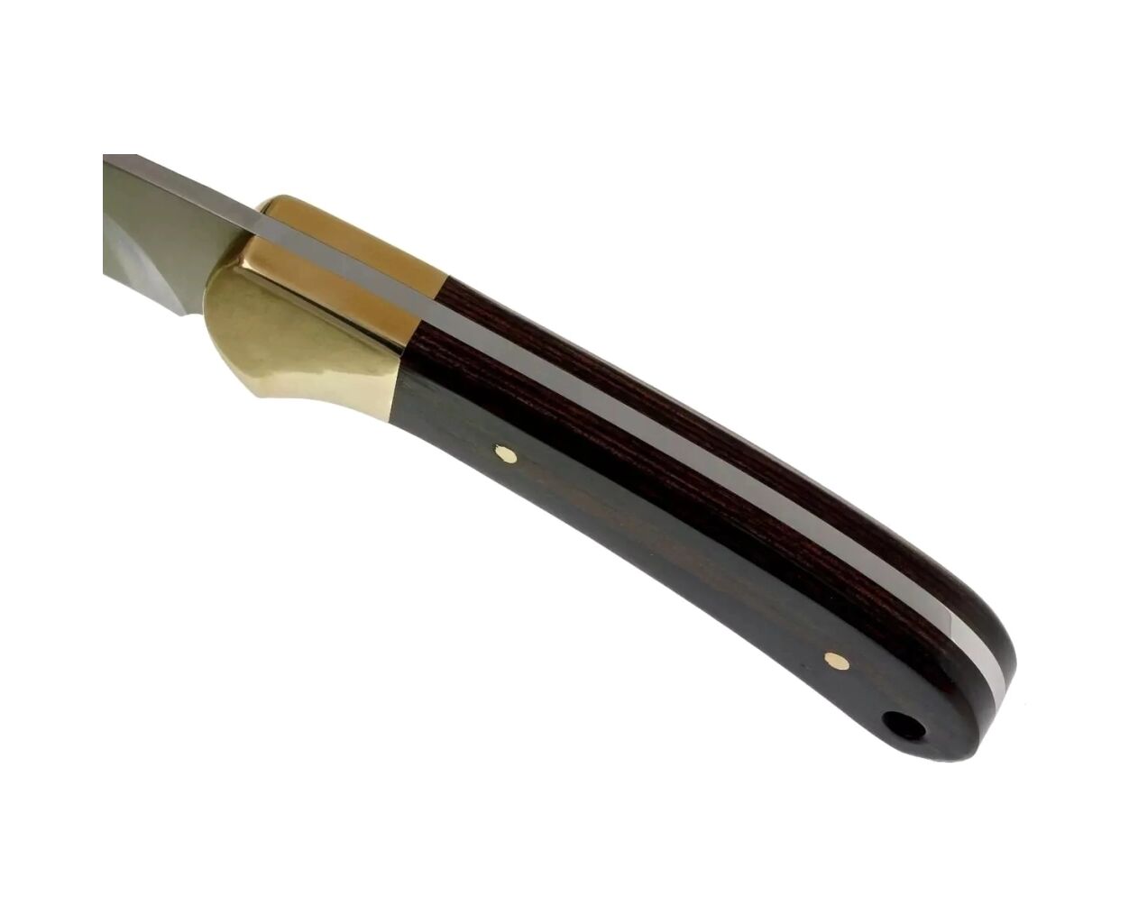 Рукоять изготовлена из натурального орехового дерева (walnut) с латунными больстерами, придающими ножу винтажный, но в то же время практичный облик. Эргономичная форма обеспечивает удобный и уверенный хват даже в тяжёлых полевых условиях.
