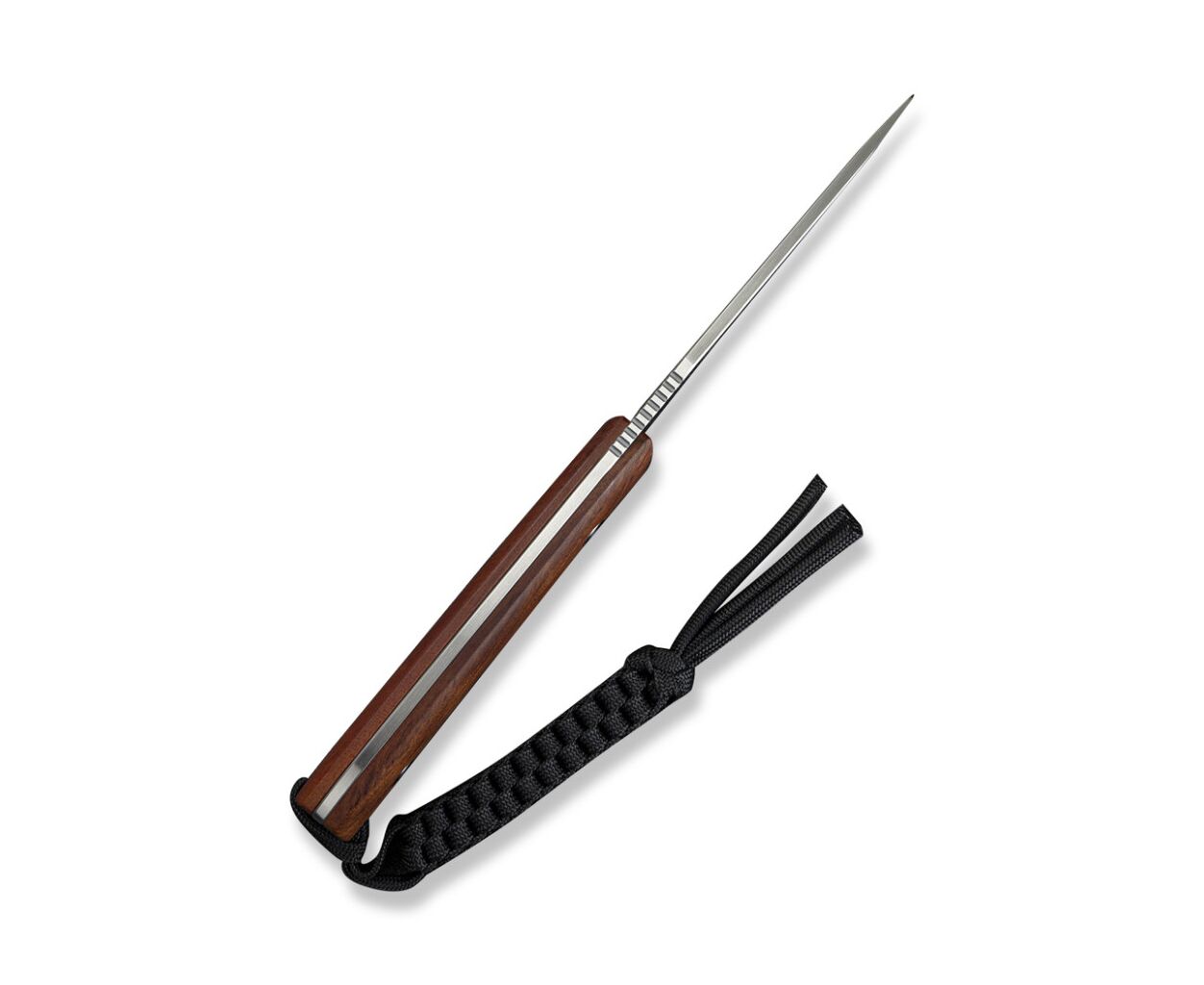 - Глубокая подпальцевая выемка на рукояти с четким упором под указательный палец предотвращает соскальзывание ладони на лезвие. Закругленные края рукояти исключают точки давления, позволяя работать в течение длительного времени без натирания руки. В хвосте рукояти закреплен темляк из паракорда.