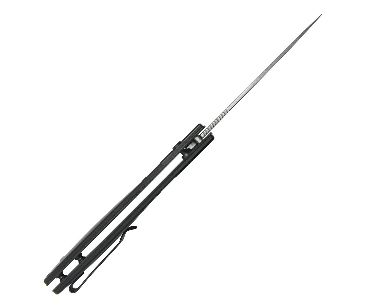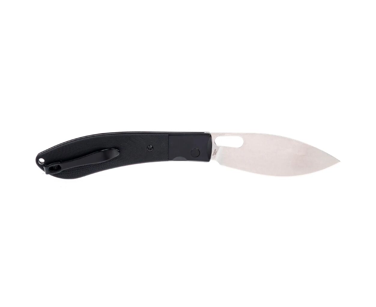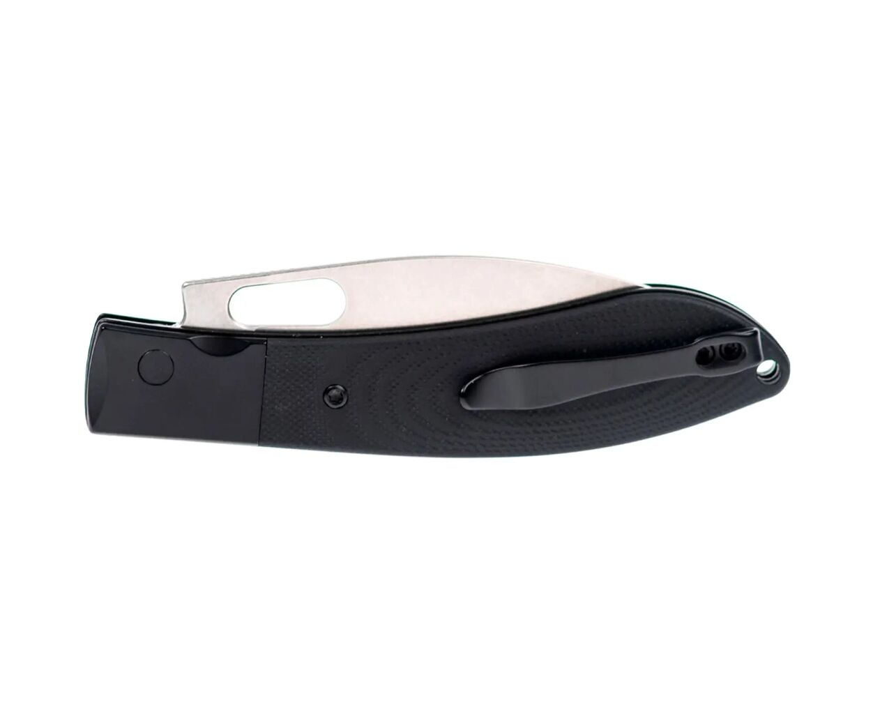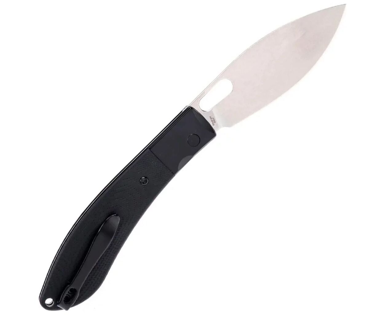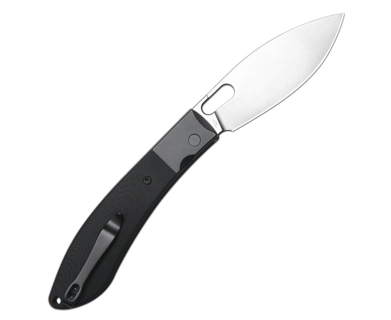Рукоять сочетает накладки из прочного G10 и стальные больстеры, образуя комфортный и надежный хват, а также подчеркивая стильный внешний вид ножа. Карманная клипса глубокой посадки позволяет незаметно носить нож в кармане, а отверстие для темляка добавляет удобства и возможности персонализации.