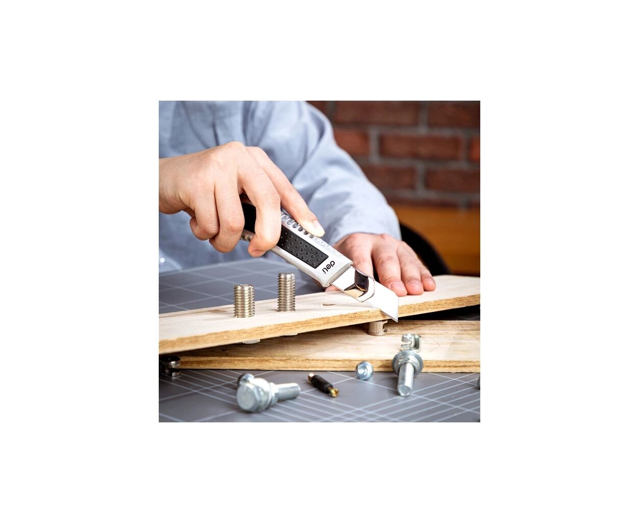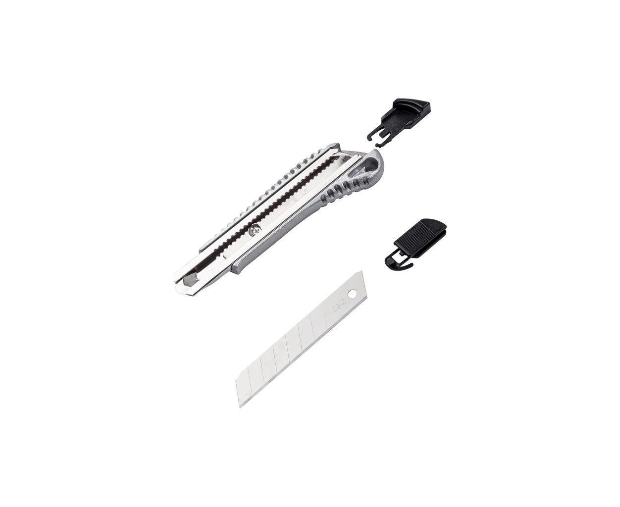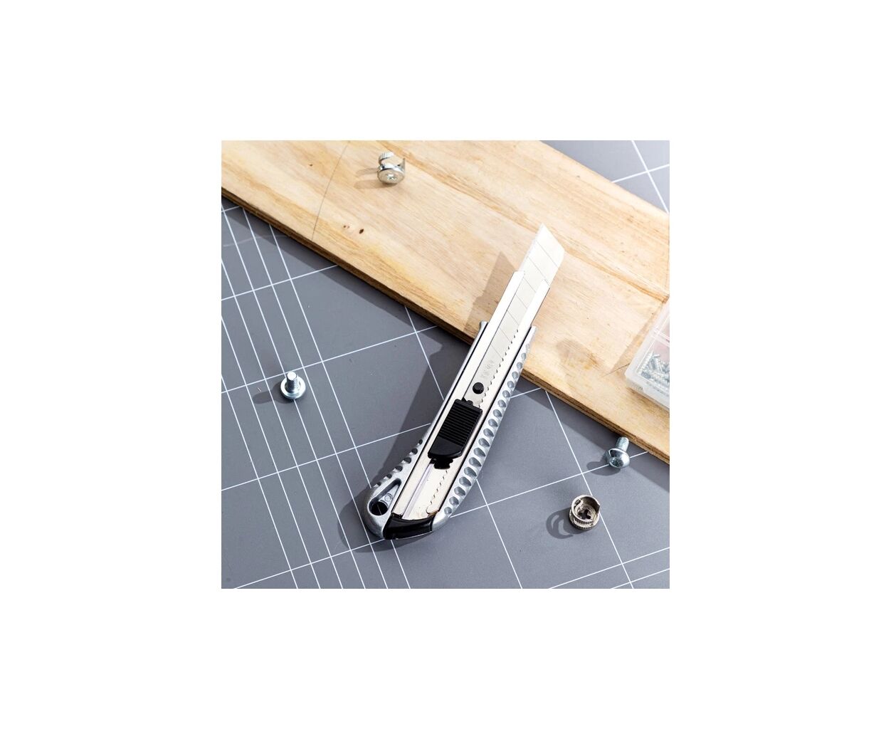 Нож с выдвижным сегментным лезвием 18 мм из инструментальной стали SK2 и корпусом из высококачественного алюминиевого сплава — прочный и точный для ежедневной резки.